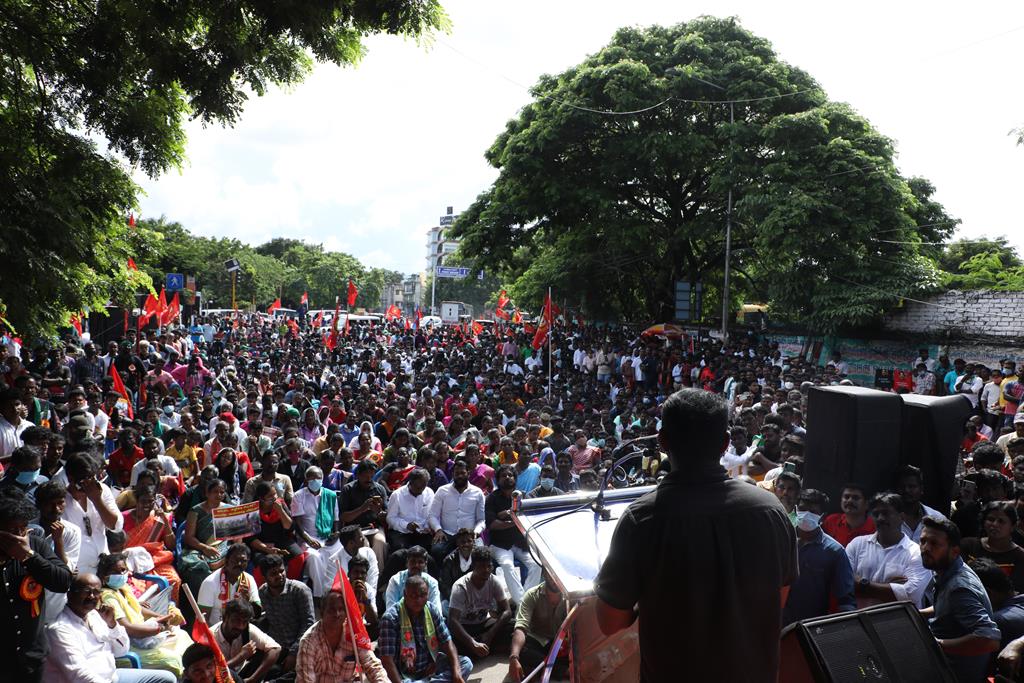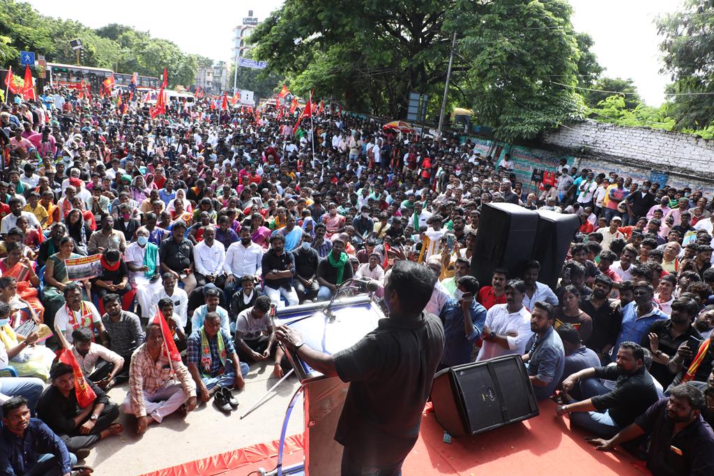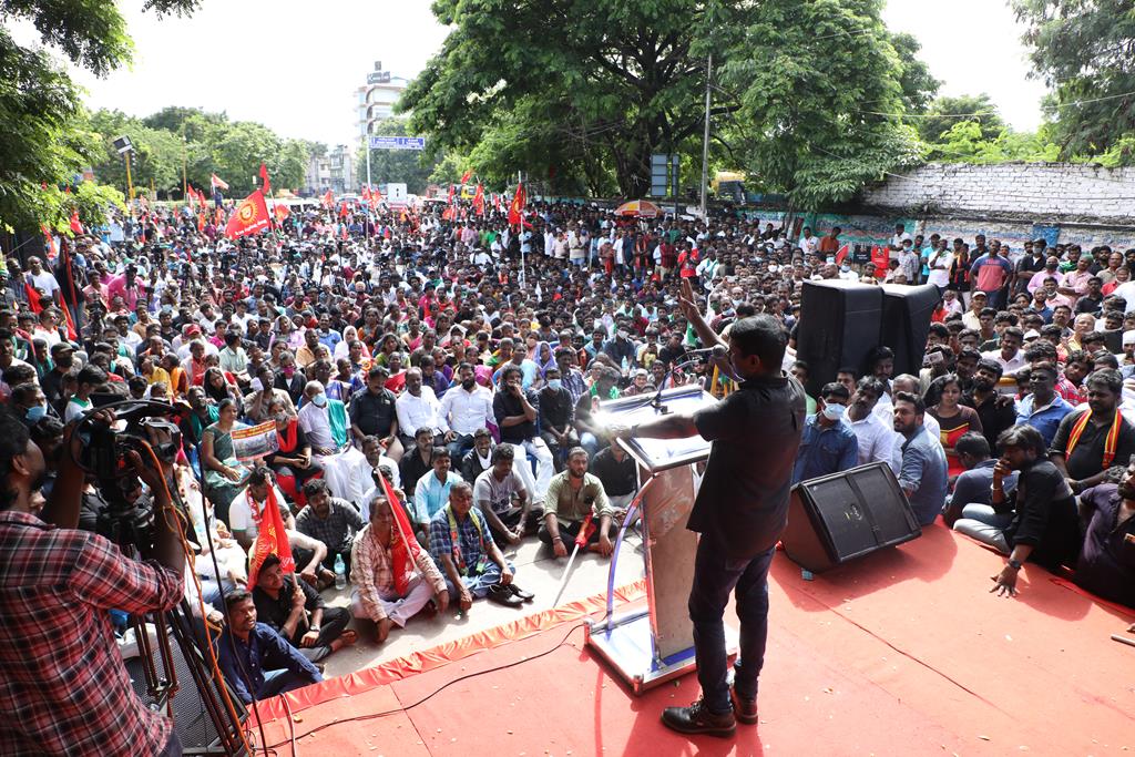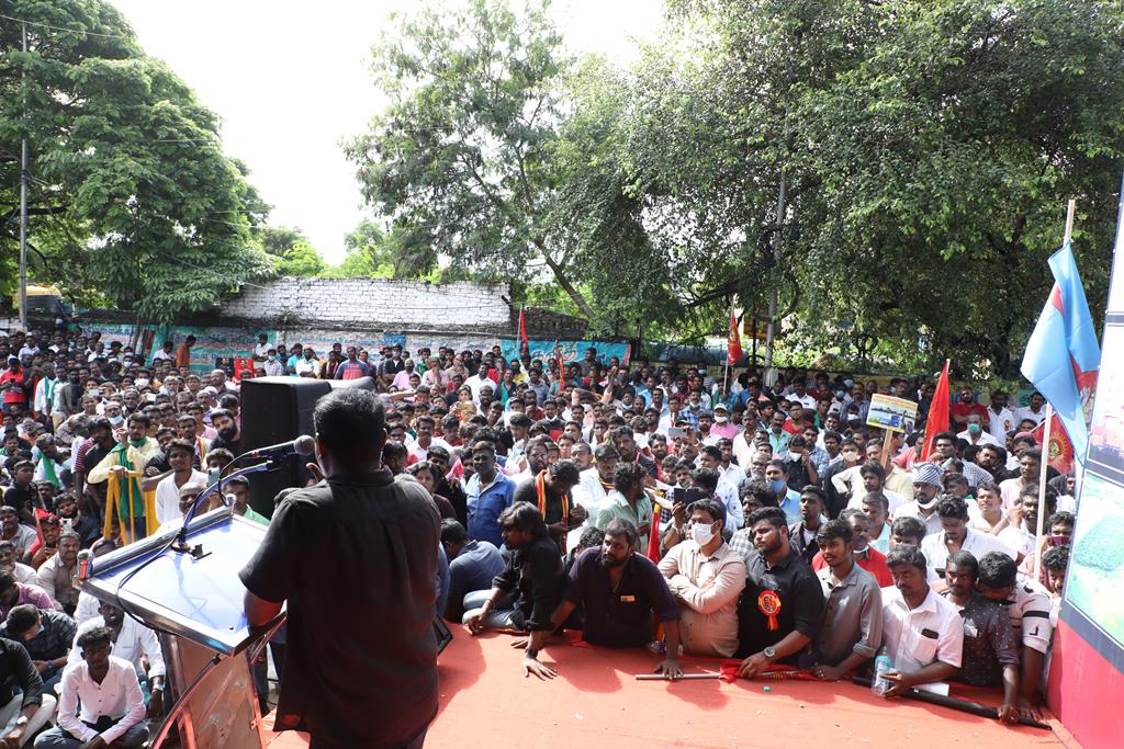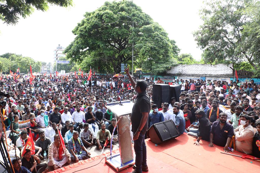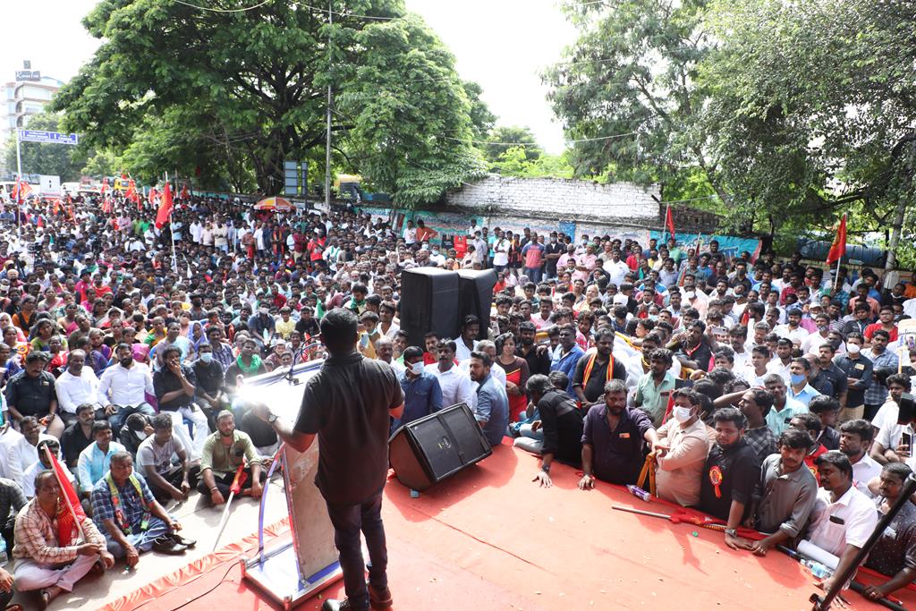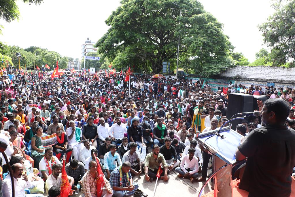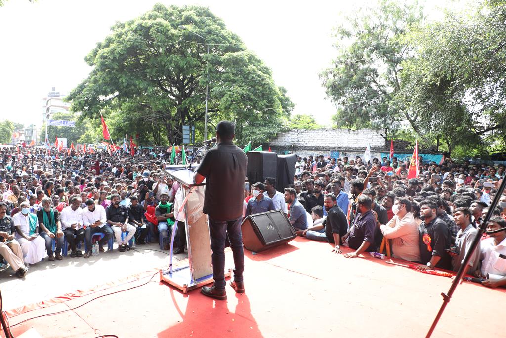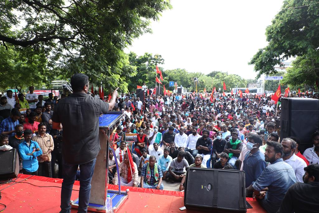 நாம் இங்கு மூன்று சிக்கல்களுக்காக ஒன்றுகூடி ஆர்ப்பாட்டம் செய்துகொண்டிருக்கிறோம். தொடர்ச்சியாக நமது இன உறவுகளான மீனவச்சொந்தங்களை இலங்கைக்கடற்படை சுட்டுக்கொல்வதை வாடிக்கையாக வைத்திருக்கிறது. அதற்கு அவர்கள் சொல்கிற காரணம், எல்லைத்தாண்டிச் செல்கிறோம் என்பதுதான். அப்படியென்றால், இந்தியக்கடல்படை இராணுவம் எல்லையில் நிறுத்தி வைக்கப்பட்டு, ‘இத்தோடு திரும்புங்கள்’ என மீனவர்களுக்கு அறிவுறுத்தியிருக்க வேண்டியதுதானே? அதனை ஏன் செய்யவில்லை? உலகின் வலிமைமிக்க கடற்படை இராணுவங்களுள் ஒன்றான இந்தியக்கடற்படை கடலுக்குள் யாரிடமிருந்து யாரைப் பாதுகாக்க வேலைசெய்கிறது? சொந்த நாட்டுக்குடிகளில் 850 க்கும் மேலான மீனவர்களைச் சுட்டுக்கொன்றிருக்கிறது இலங்கைக்கடற்படை. இதுகொலை செய்தது மட்டும்தான்; படகைப் பறித்தது, அடித்துத் துரத்தியது, சித்ரவதை செய்தது, வலையைக் கிழித்தது, சிறைப்படுத்தியது இதுவெல்லாம் தனி. என்றைக்காவது சிங்களக்கடற்படை தமிழக மீனவர்களைச் சிறைபிடிக்க வரும்போது அல்லது தாக்க வரும்போது இந்தியக்கடற்படை இராணுவம் தடுத்து அவர்களைக் காப்பாற்றியது எனும் செய்தியை எவராவது கேள்விப்பட்டதுண்டா? இல்லை! அப்புறம், எதற்காகக் கடற்படை இராணுவம்? தம்பி ராஜ்கிரணுக்குத் திருமணமாகி 40 நாட்கள்தான் ஆகிறது. அவனை அடித்துக்கொலைசெய்து, அவன் மீது எரிதிரவத்தை ஊற்றியிருக்கிறார்கள். அவன் இறந்தப்பிறகும்கூட, அவனைவிடுவதற்கு சிங்களக்கடற்படையினருக்கு மனமில்லை. என்னவொரு குரூரமான மனநிலை? எவ்வளவு வன்மம்? நாங்கள் எல்லைத்தாண்டிச் செல்வதாகக் குற்றஞ்சாட்டுகிறார்கள். அருகாமையிலிருக்கும் கேரள மீனவர்கள் எல்லைத்தாண்டிச் செல்வதில்லையா? செல்கிறார்கள்! ஆனால், எல்லைத் தாண்டிச்சென்றாலும் கேரள மீனவனை சிங்கள இராணுவம் ஒருபோதும் தொடுவதில்லை; எல்லைத்தாண்டவில்லையென்றாலும், தமிழர்களைத் தாக்குகிறார்கள். காரணம், சிங்களர்களின் ஆழ்மனதிலிருக்கிற தமிழர்கள் மீதான வன்மம். எங்கள் தம்பிகள் தாங்கள் அனுபவித்தக் கொடுமைகளைக் கதை கதையாகக் கூறுவார்கள்.