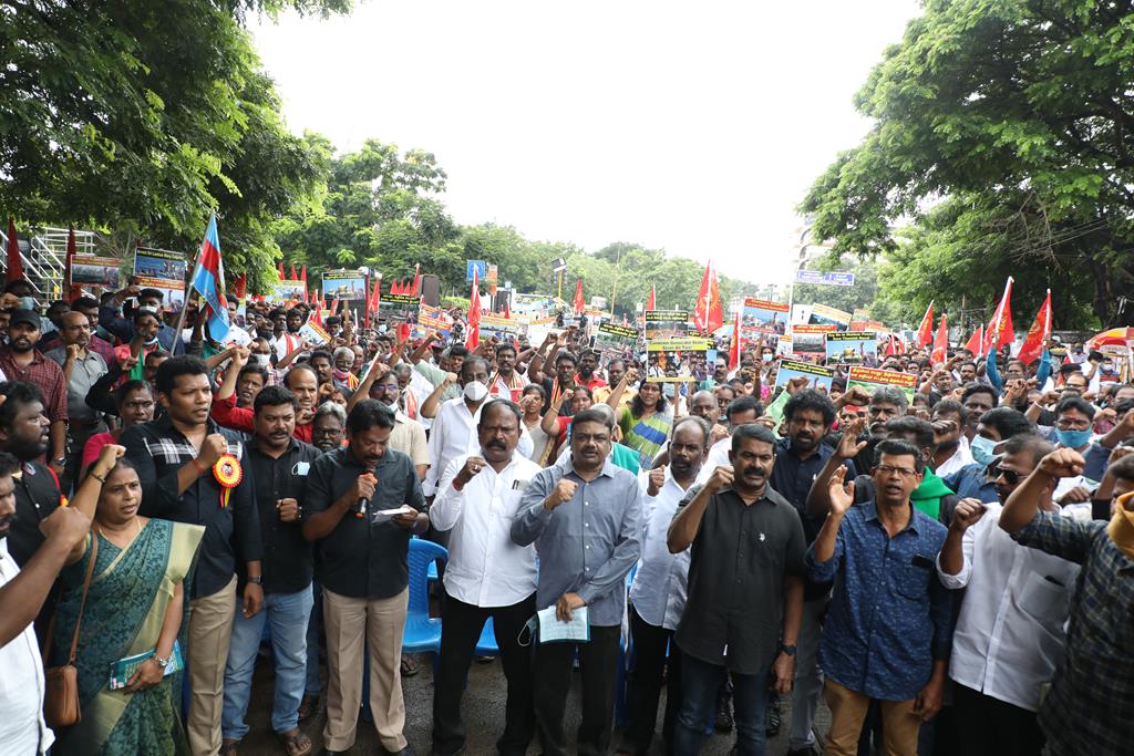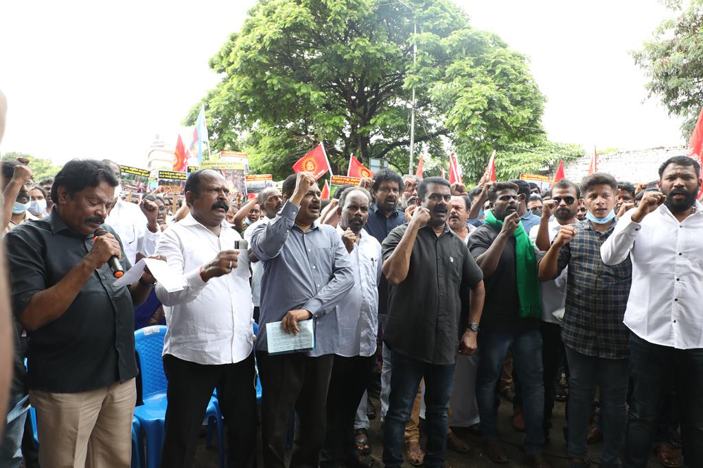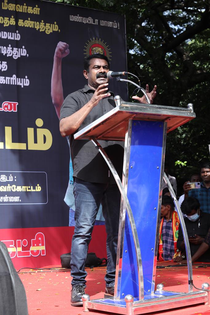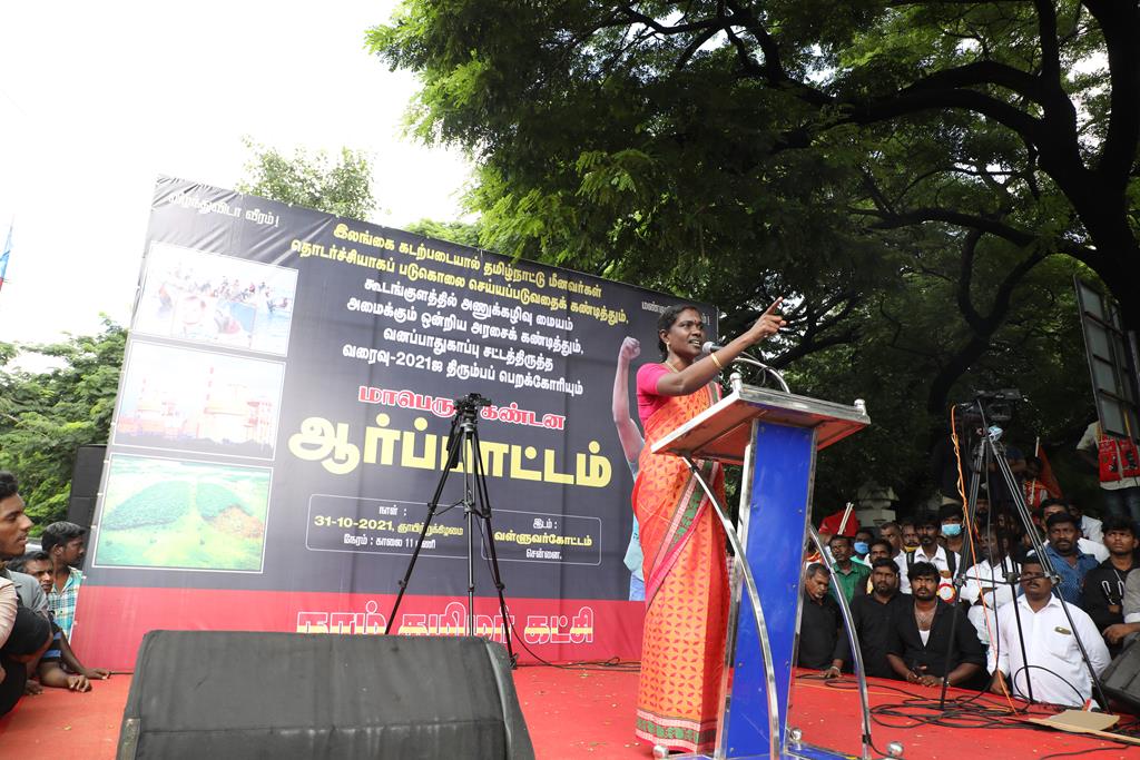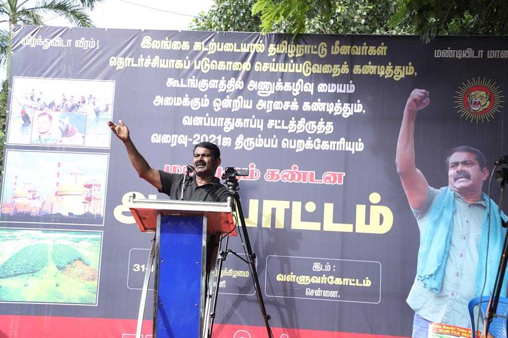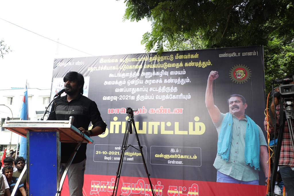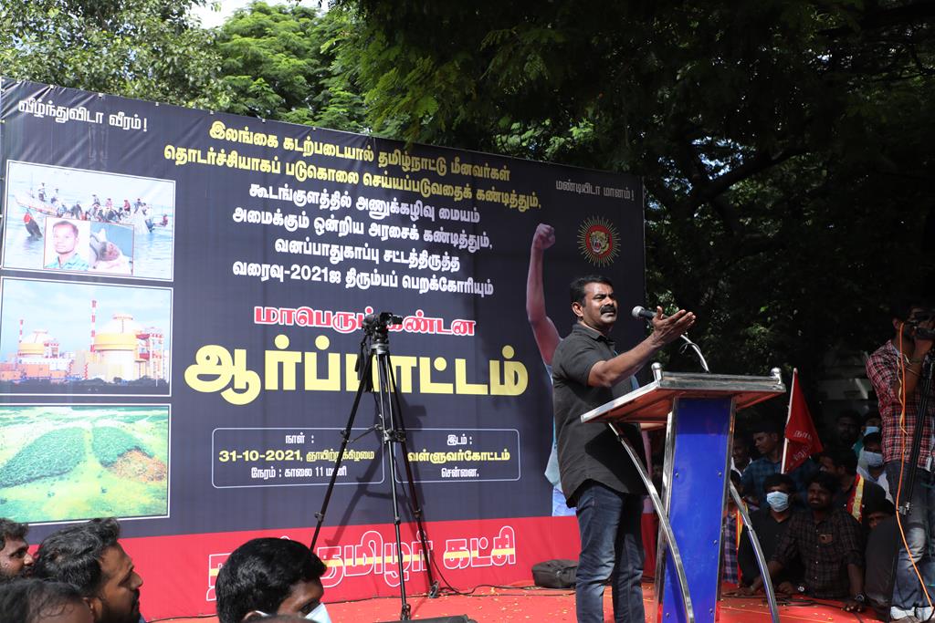 இலங்கை கடற்படையால் தமிழ்நாட்டு மீனவர்கள் தொடர்ச்சியாகப் படுகொலை செய்யப்படுவதைக் கண்டித்தும், கூடங்குளத்தில் அணுக்கழிவு மையம் அமைப்பதற்கு எதிர்ப்புத் தெரிவித்தும், வனப்பாதுகாப்பு சட்டத்திருத்த வரைவு – 2021ஐ திரும்பப்பெற வலியுறுத்தியும் இந்திய ஒன்றிய அரசுக்கெதிராக 31.10.21 அன்று சென்னை, வள்ளுவர் கோட்டத்தில் நாம் தமிழர் கட்சி சார்பாக தலைமை ஒருங்கிணைப்பாளர் செந்தமிழன் சீமான் அவர்கள் தலைமையில் மாபெரும் கண்டன ஆர்ப்பாட்டம் நடைபெற்றது.