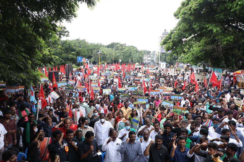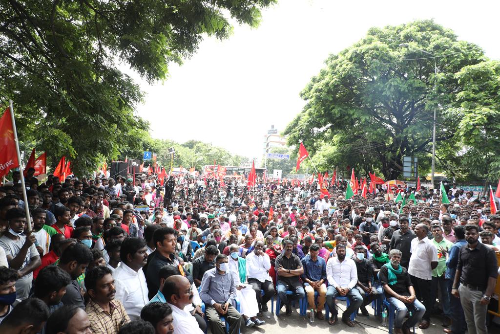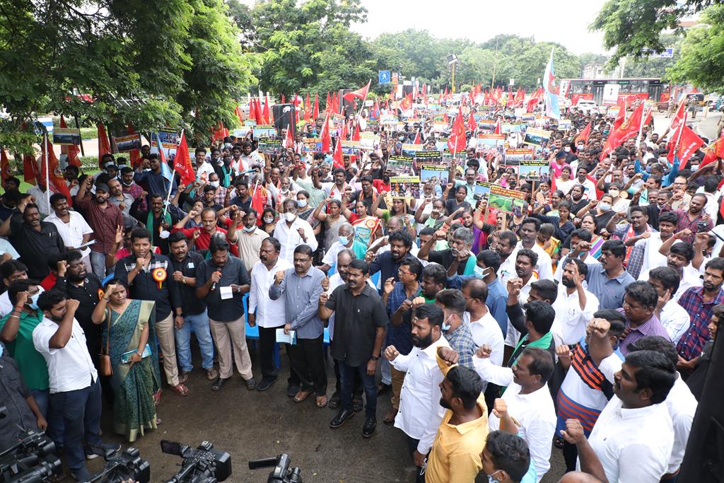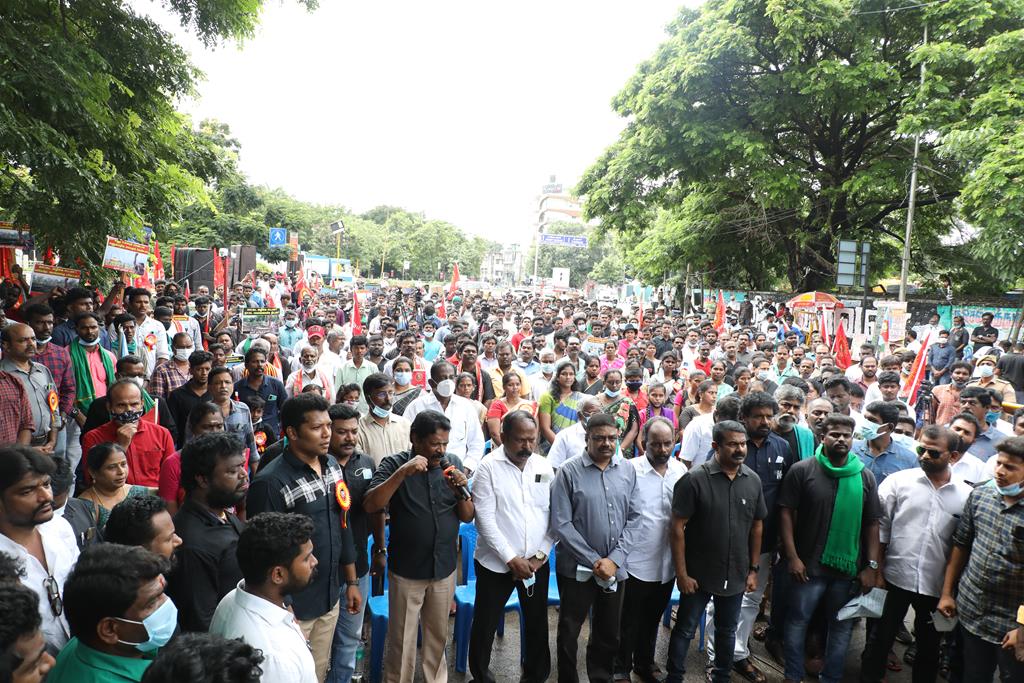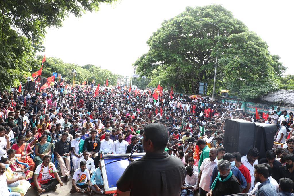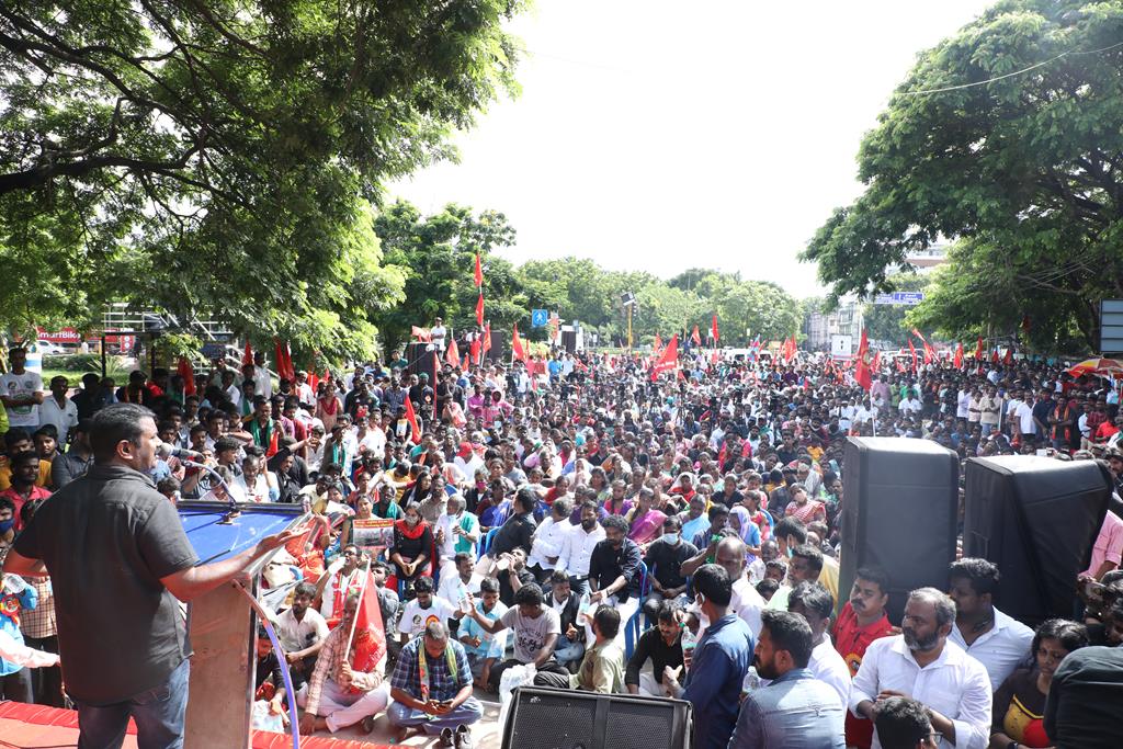 இலங்கை கடற்படையால் தமிழ்நாட்டு மீனவர்கள் தொடர்ச்சியாகப் படுகொலை செய்யப்படுவதைக் கண்டித்தும், கூடங்குளத்தில் அணுக்கழிவு மையம் அமைப்பதற்கு எதிர்ப்புத் தெரிவித்தும், வனப்பாதுகாப்பு சட்டத்திருத்த வரைவு – 2021ஐ திரும்பப்பெற வலியுறுத்தியும் இந்திய ஒன்றிய அரசுக்கெதிராக 31.10.21 அன்று சென்னை, வள்ளுவர் கோட்டத்தில் நாம் தமிழர் கட்சி சார்பாக தலைமை ஒருங்கிணைப்பாளர் செந்தமிழன் சீமான் அவர்கள் தலைமையில் மாபெரும் கண்டன ஆர்ப்பாட்டம் நடைபெற்றது.