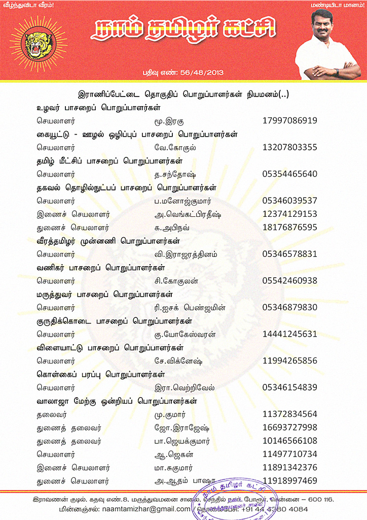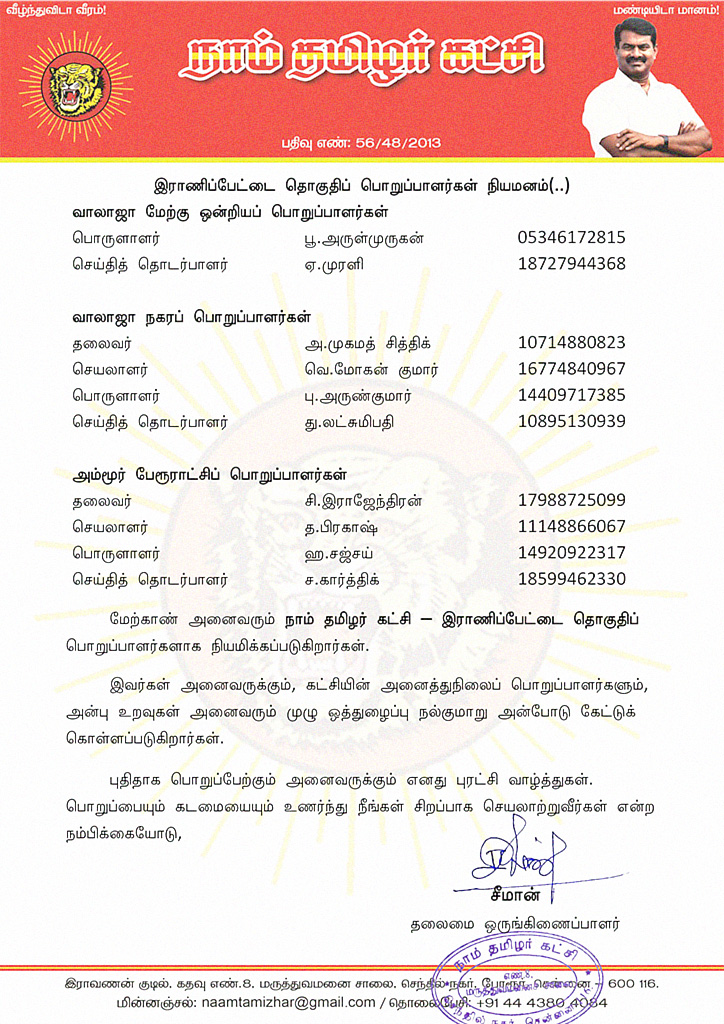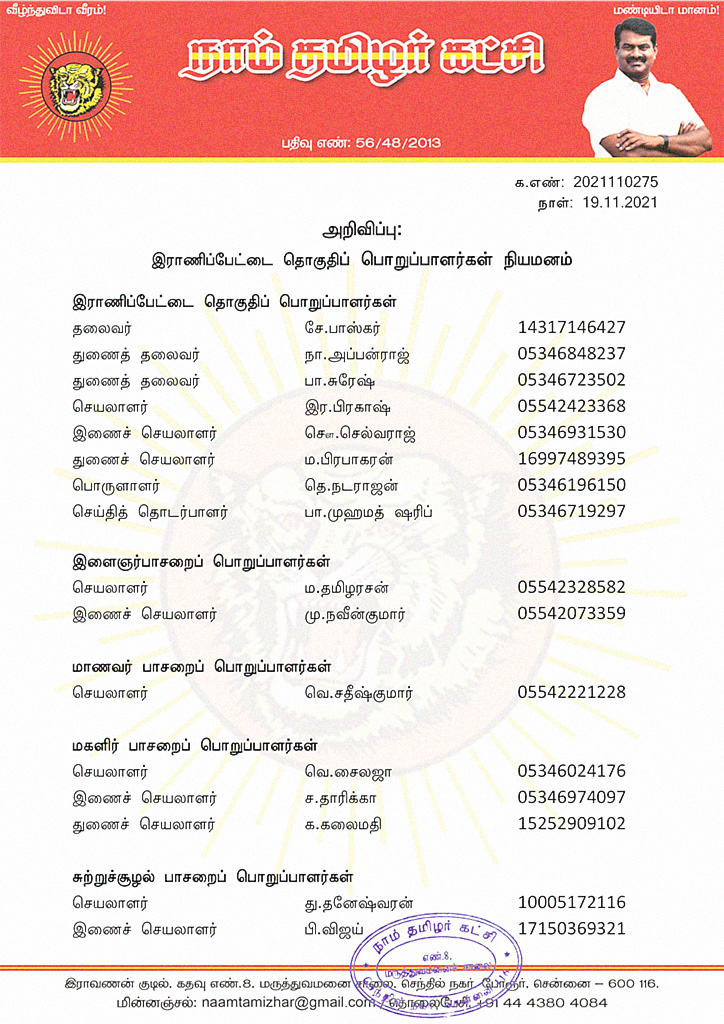 மேற்காண் அனைவரும் நாம் தமிழர் கட்சி – இராணிப்பேட்டை தொகுதிப் பொறுப்பாளர்களாக நியமிக்கப்படுகிறார்கள்.