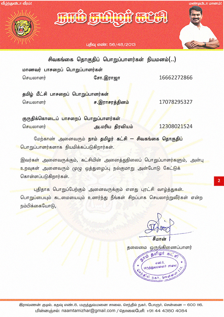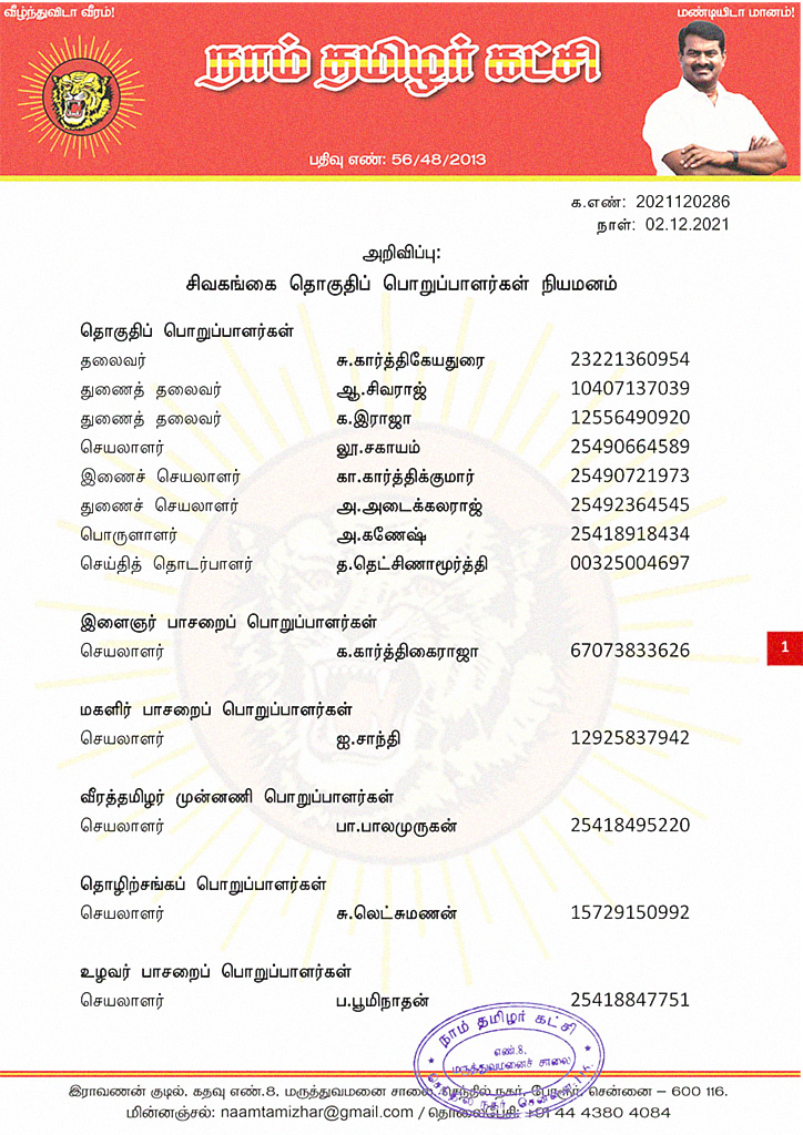 மேற்காண் அனைவரும் நாம் தமிழர் கட்சி – சிவகங்கை தொகுதிப் பொறுப்பாளர்களாக நியமிக்கப்படுகிறார்கள்.