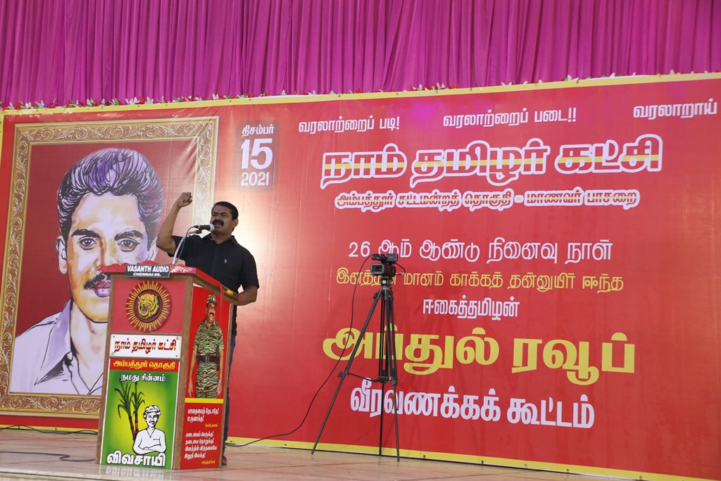 இனத்தின் மானம் காக்க தன்னுயிர் ஈந்த ‘ஈகைத்தமிழன்’ அப்துல் ரவூப் அவர்களின் 26ஆம் ஆண்டு நினைவுநாளையொட்டி வீரவணக்கக் கூட்டம் நாம் தமிழர் மாணவர் பாசறை சார்பாக 15-12-2021 புதன்கிழமையன்று மாலை 5 மணியளவில் அம்பத்தூர் தொழிற்பேட்டையில் அமைந்துள்ள எச்.பி.எம். பாரடைஸ் அரங்கத்தில், தலைமை ஒருங்கிணைப்பாளர் சீமான் அவர்களின் தலைமையில் நடைபெற்றது.