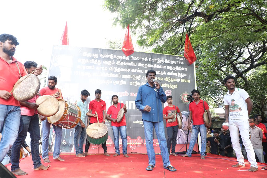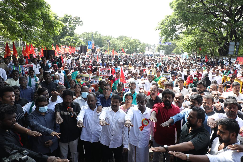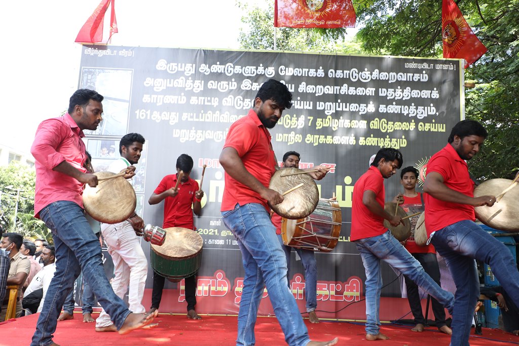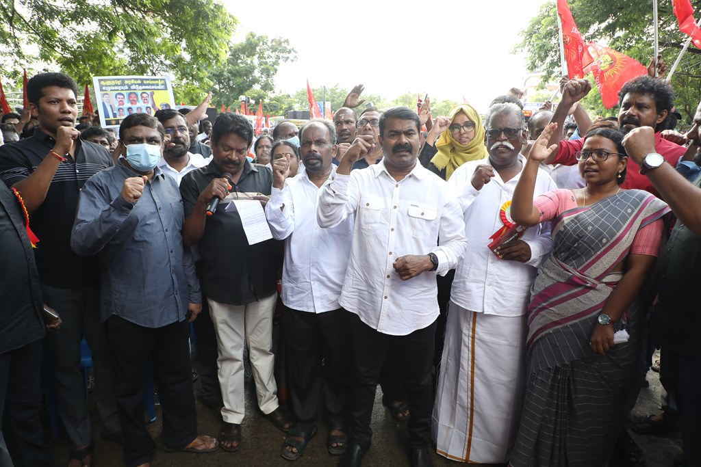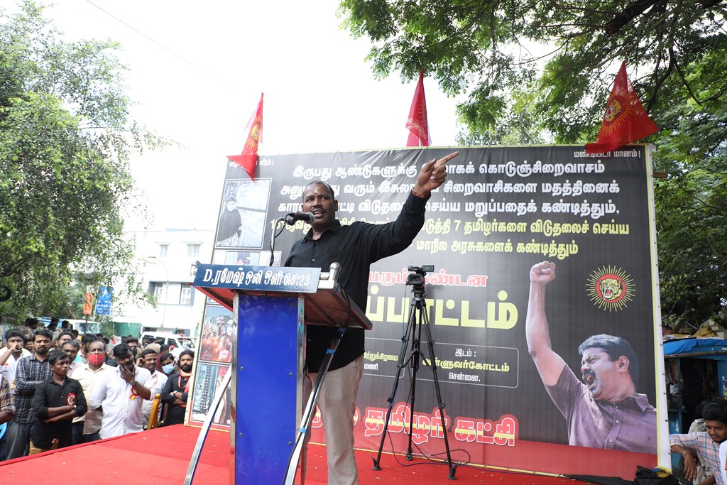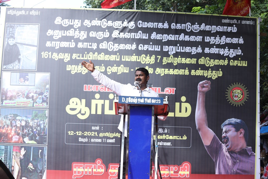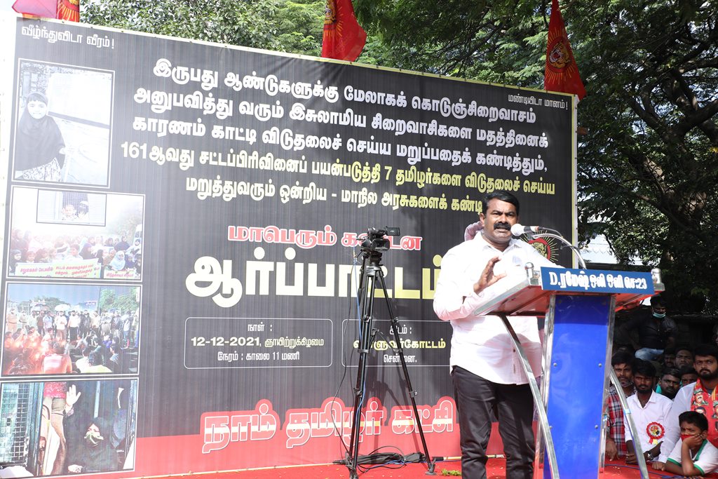 20 ஆண்டுகளுக்கும் மேலாகக் கொடுஞ்சிறைவாசம் அனுபவித்து வரும் இசுலாமிய சிறைவாசிகளை மதத்தினைக் காரணமாகக் காட்டி விடுதலை செய்ய முடியாது என அரசாணை வெளியிட்டுள்ள திமுக அரசின் மதவாதப்போக்கைக் கண்டித்தும், ராஜீவ் காந்தி கொலை வழக்கில் சிக்குண்டு 30 ஆண்டுகளாகச் சிறைக்கொட்டடியில் வாடும் ஏழு தமிழர்களையும் விடுதலை செய்ய 161வது சட்டப்பிரிவின்படி மாநில அரசுக்கே அதிகாரமிருக்கும்போது குடியரசுத்தலைவருக்குக் கடிதமெழுதி மாநிலத் தன்னுரிமையையும், தன்னாட்சியையும் காவுகொடுத்திருக்கும் திமுக அரசின் வஞ்சகப் போக்கைக் கண்டித்தும், 12.12.2021 அன்று காலை 10 மணியளவில், சென்னை – வள்ளுவர் கோட்டத்தில் நாம் தமிழர் கட்சி ஒருங்கிணைத்த மாபெரும் கண்டன ஆர்ப்பாட்டம் நடைபெற்றது.