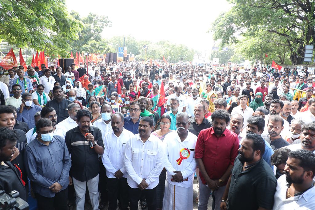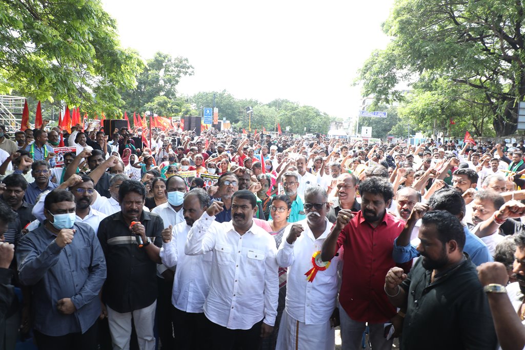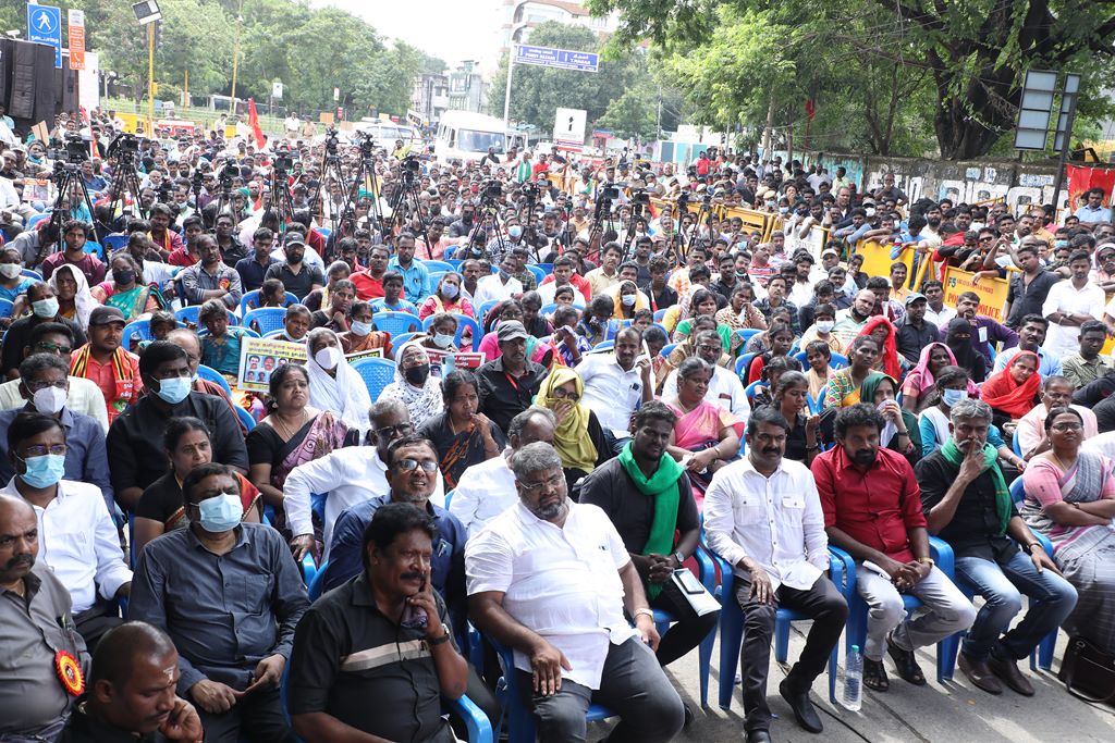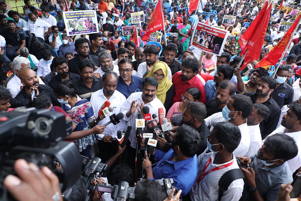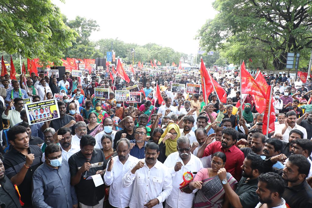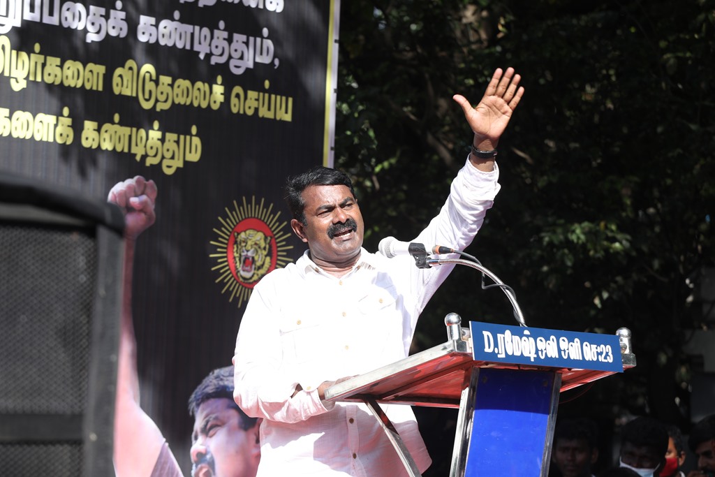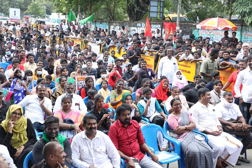 20 ஆண்டுகளுக்கும் மேலாகக் கொடுஞ்சிறைவாசம் அனுபவித்து வரும் இசுலாமிய சிறைவாசிகளை மதத்தினைக் காரணமாகக் காட்டி விடுதலை செய்ய முடியாது என அரசாணை வெளியிட்டுள்ள திமுக அரசின் மதவாதப்போக்கைக் கண்டித்தும், ராஜீவ் காந்தி கொலை வழக்கில் சிக்குண்டு 30 ஆண்டுகளாகச் சிறைக்கொட்டடியில் வாடும் ஏழு தமிழர்களையும் விடுதலை செய்ய 161வது சட்டப்பிரிவின்படி மாநில அரசுக்கே அதிகாரமிருக்கும்போது குடியரசுத்தலைவருக்குக் கடிதமெழுதி மாநிலத் தன்னுரிமையையும், தன்னாட்சியையும் காவுகொடுத்திருக்கும் திமுக அரசின் வஞ்சகப் போக்கைக் கண்டித்தும், 12.12.2021 அன்று காலை 10 மணியளவில், சென்னை – வள்ளுவர் கோட்டத்தில் நாம் தமிழர் கட்சி ஒருங்கிணைத்த மாபெரும் கண்டன ஆர்ப்பாட்டம் நடைபெற்றது.