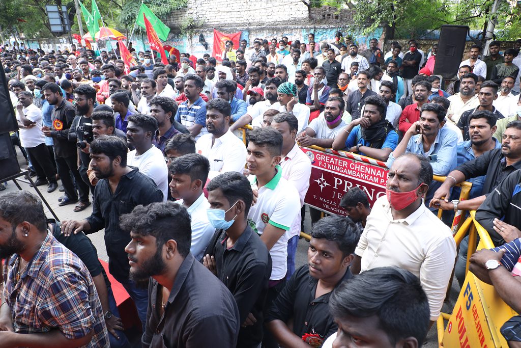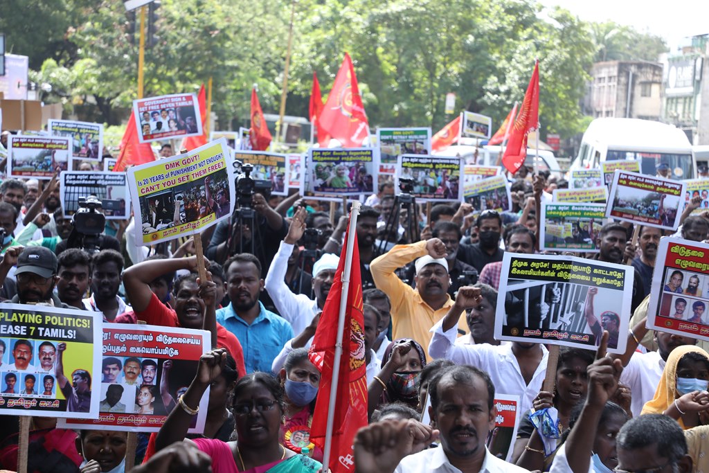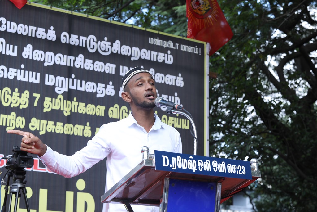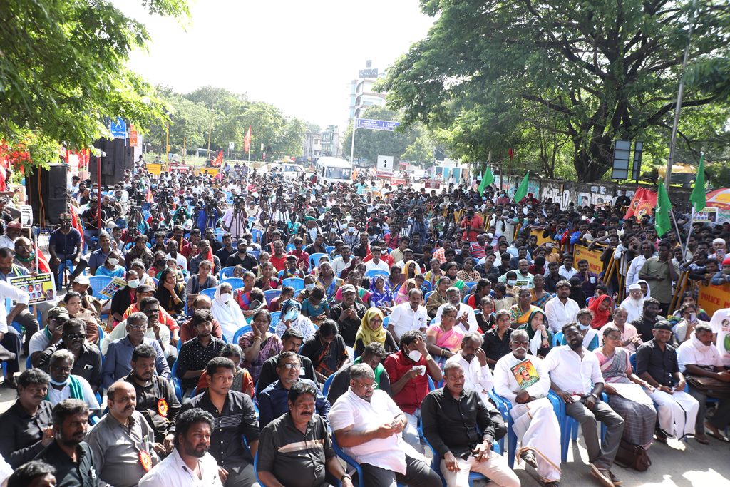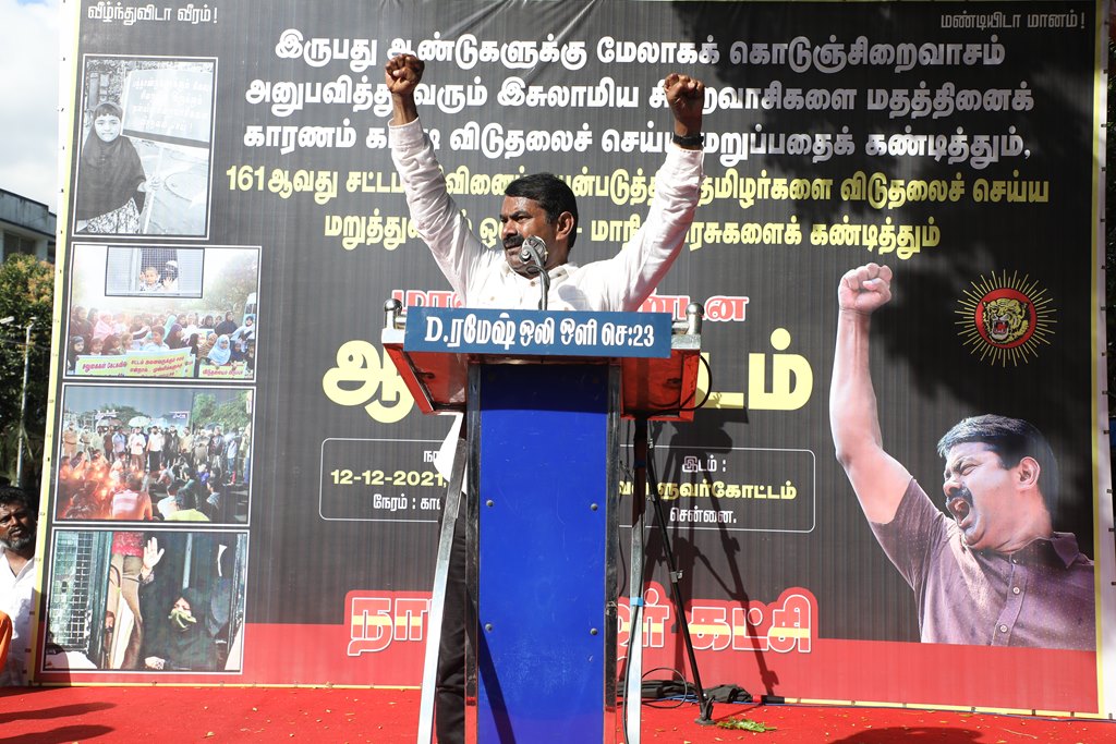 20 ஆண்டுகளுக்கும் மேலாகக் கொடுஞ்சிறைவாசம் அனுபவித்து வரும் இசுலாமிய சிறைவாசிகளை மதத்தினைக் காரணமாகக் காட்டி விடுதலை செய்ய முடியாது என அரசாணை வெளியிட்டுள்ள திமுக அரசின் மதவாதப்போக்கைக் கண்டித்தும், ராஜீவ் காந்தி கொலை வழக்கில் சிக்குண்டு 30 ஆண்டுகளாகச் சிறைக்கொட்டடியில் வாடும் ஏழு தமிழர்களையும் விடுதலை செய்ய 161வது சட்டப்பிரிவின்படி மாநில அரசுக்கே அதிகாரமிருக்கும்போது குடியரசுத்தலைவருக்குக் கடிதமெழுதி மாநிலத் தன்னுரிமையையும், தன்னாட்சியையும் காவுகொடுத்திருக்கும் திமுக அரசின் வஞ்சகப் போக்கைக் கண்டித்தும், 12.12.2021 அன்று காலை 10 மணியளவில், சென்னை – வள்ளுவர் கோட்டத்தில் நாம் தமிழர் கட்சி ஒருங்கிணைத்த மாபெரும் கண்டன ஆர்ப்பாட்டம் நடைபெற்றது.