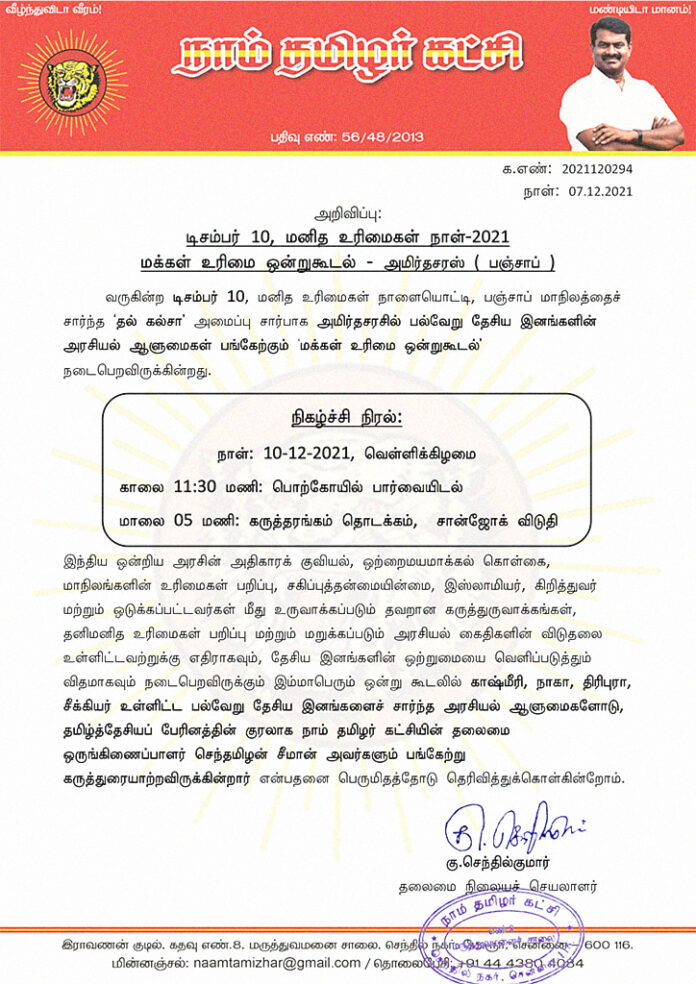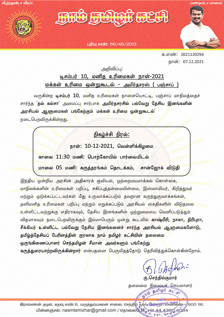 வருகின்ற டிசம்பர் 10, மனித உரிமைகள் நாளையொட்டி, பஞ்சாப் மாநிலத்தைச் சார்ந்த ‘தல் கல்சா’ அமைப்பு சார்பாக அமிர்தசரசில் பல்வேறு தேசிய இனங்களின் அரசியல் ஆளுமைகள் பங்கேற்கும் ‘மக்கள் உரிமை ஒன்றுகூடல்’ நடைபெறவிருக்கின்றது.