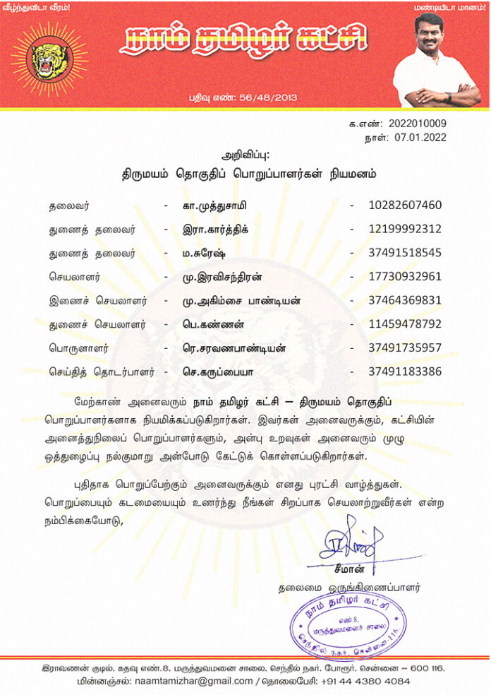 மேற்காண் அனைவரும் நாம் தமிழர் கட்சி – திருமயம் தொகுதிப் பொறுப்பாளர்களாக நியமிக்கப்படுகிறார்கள். இவர்கள் அனைவருக்கும், கட்சியின் அனைத்துநிலைப் பொறுப்பாளர்களும், அன்பு உறவுகள் அனைவரும் முழு ஒத்துழைப்பு நல்குமாறு அன்போடு கேட்டுக் கொள்ளப்படுகிறார்கள்.