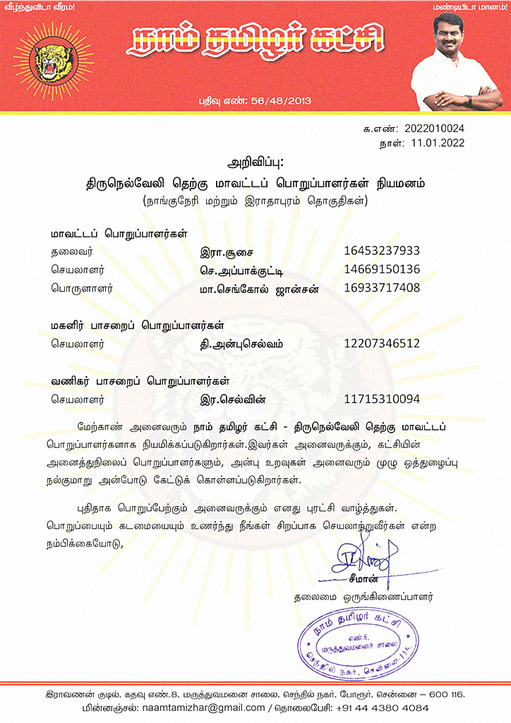 மேற்காண் அனைவரும் நாம் தமிழர் கட்சி – திருநெல்வேலி தெற்கு மாவட்டப் பொறுப்பாளர்களாக நியமிக்கப்படுகிறார்கள்.இவர்கள் அனைவருக்கும், கட்சியின் அனைத்துநிலைப் பொறுப்பாளர்களும், அன்பு உறவுகள் அனைவரும் முழு ஒத்துழைப்பு நல்குமாறு அன்போடு கேட்டுக் கொள்ளப்படுகிறார்கள்.