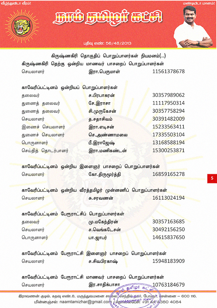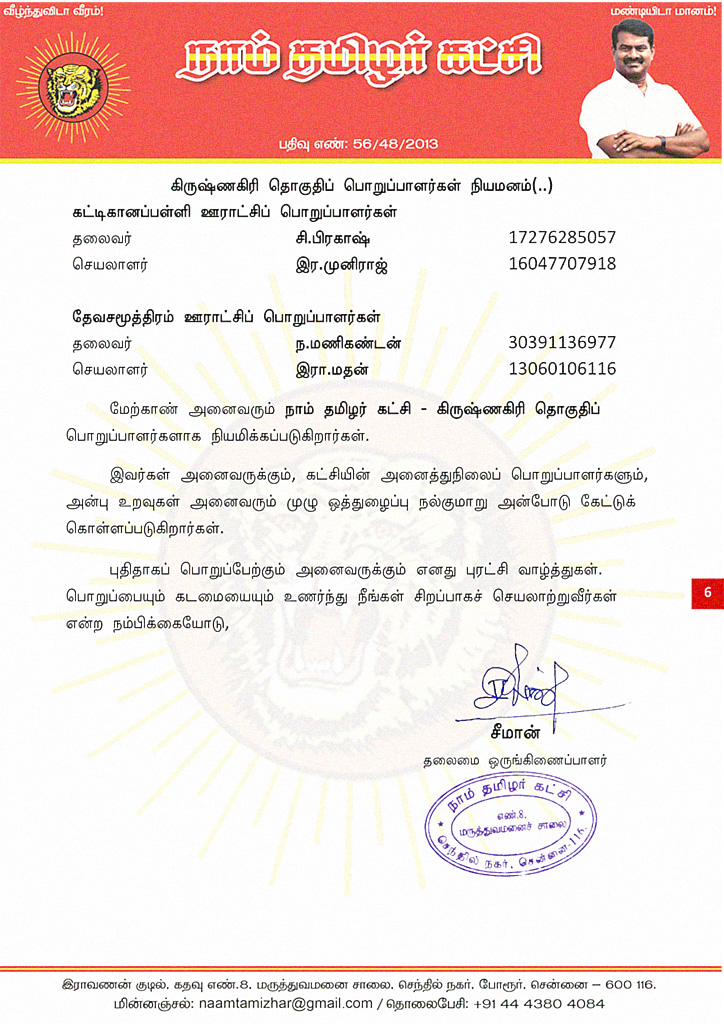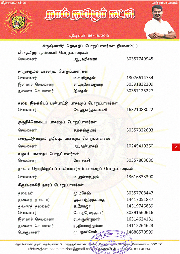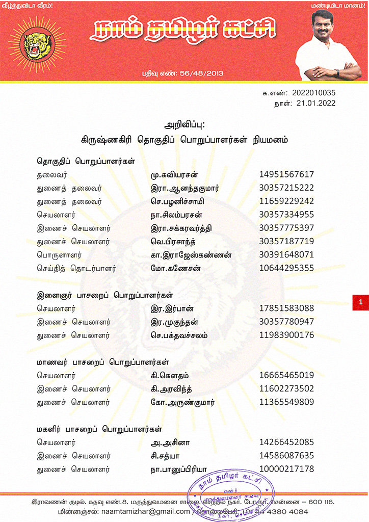 மேற்காண் அனைவரும் நாம் தமிழர் கட்சி – கிருஷ்ணகிரி தொகுதிப் பொறுப்பாளர்களாக நியமிக்கப்படுகிறார்கள்.