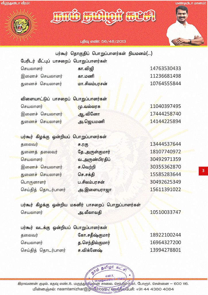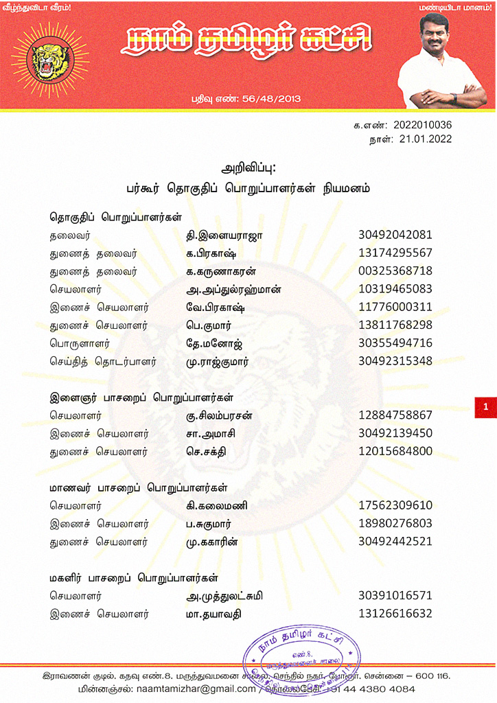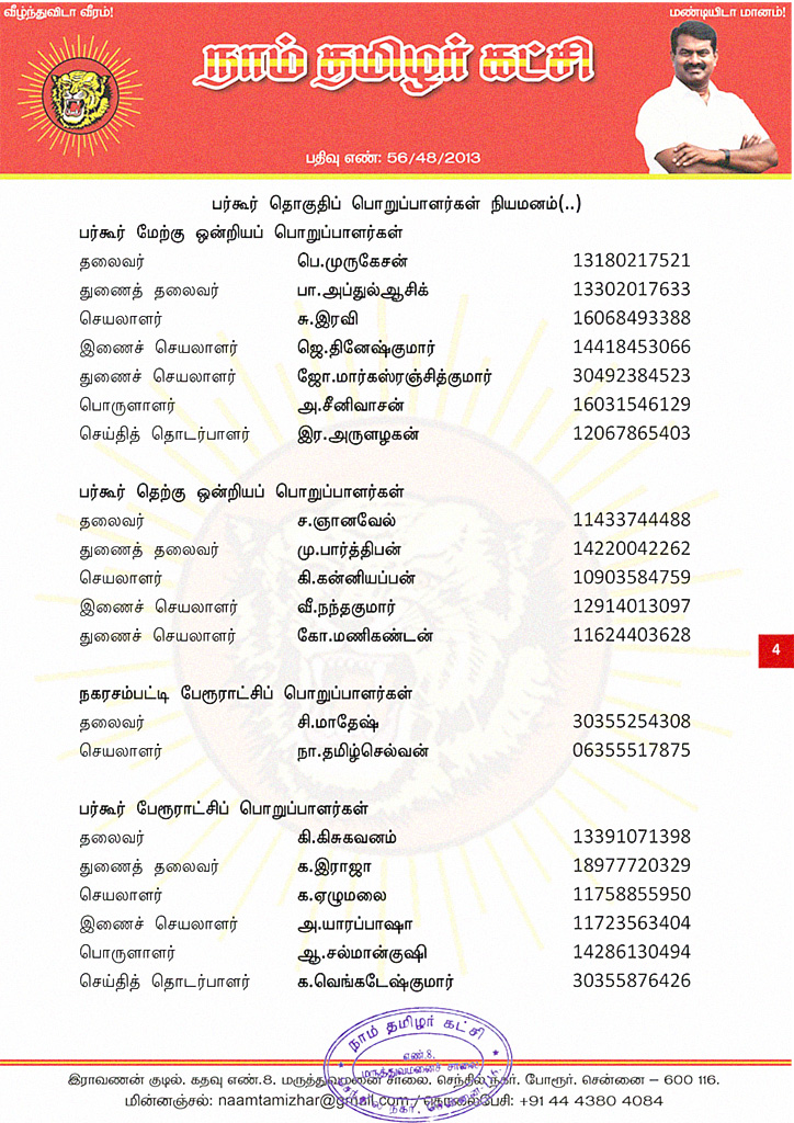 மேற்காண் அனைவரும் நாம் தமிழர் கட்சி – பர்கூர் தொகுதிப் பொறுப்பாளர்களாக நியமிக்கப்படுகிறார்கள்.