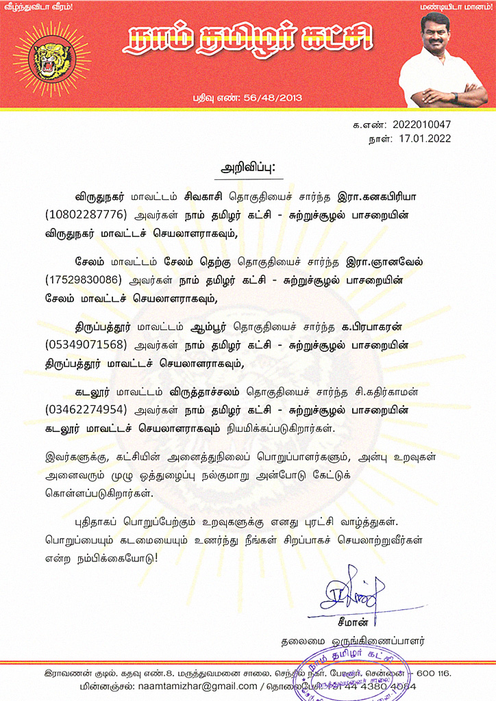 விருதுநகர் மாவட்டம் சிவகாசி தொகுதியைச் சார்ந்த இரா.கனகபிரியா (10802287776) அவர்கள் நாம் தமிழர் கட்சி – சுற்றுச்சூழல் பாசறையின் விருதுநகர் மாவட்டச் செயலாளராகவும்,