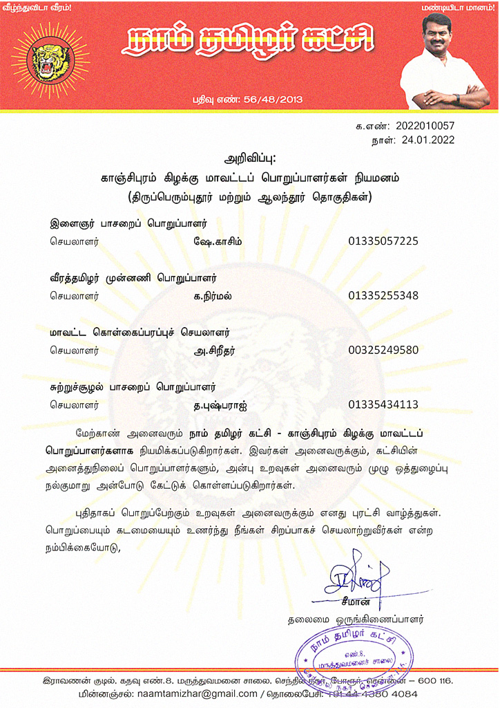 மேற்காண் அனைவரும் நாம் தமிழர் கட்சி – காஞ்சிபுரம் கிழக்கு மாவட்டப் பொறுப்பாளர்களாக நியமிக்கப்படுகிறார்கள். இவர்கள் அனைவருக்கும், கட்சியின் அனைத்துநிலைப் பொறுப்பாளர்களும், அன்பு உறவுகள் அனைவரும் முழு ஒத்துழைப்பு நல்குமாறு அன்போடு கேட்டுக் கொள்ளப்படுகிறார்கள்.