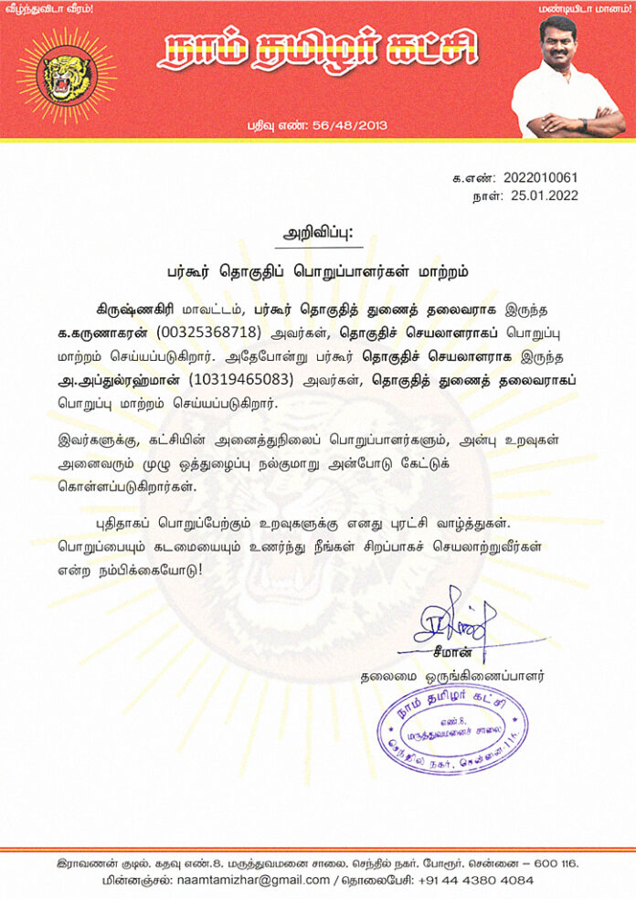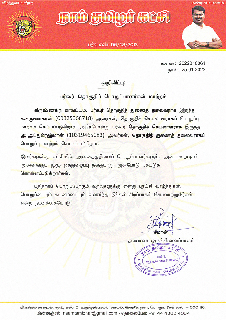 கிருஷ்ணகிரி மாவட்டம், பர்கூர் தொகுதித் துணைத் தலைவராக இருந்த க.கருணாகரன் (00325368718) அவர்கள், தொகுதிச் செயலாளராகப் பொறுப்பு மாற்றம் செய்யப்படுகிறார். அதேபோன்று, பர்கூர் தொகுதிச் செயலாளராக இருந்த அ.அப்துல்ரஹ்மான் (10319465083) அவர்கள், தொகுதித் துணைத் தலைவராகப் பொறுப்பு மாற்றம் செய்யப்படுகிறார்.