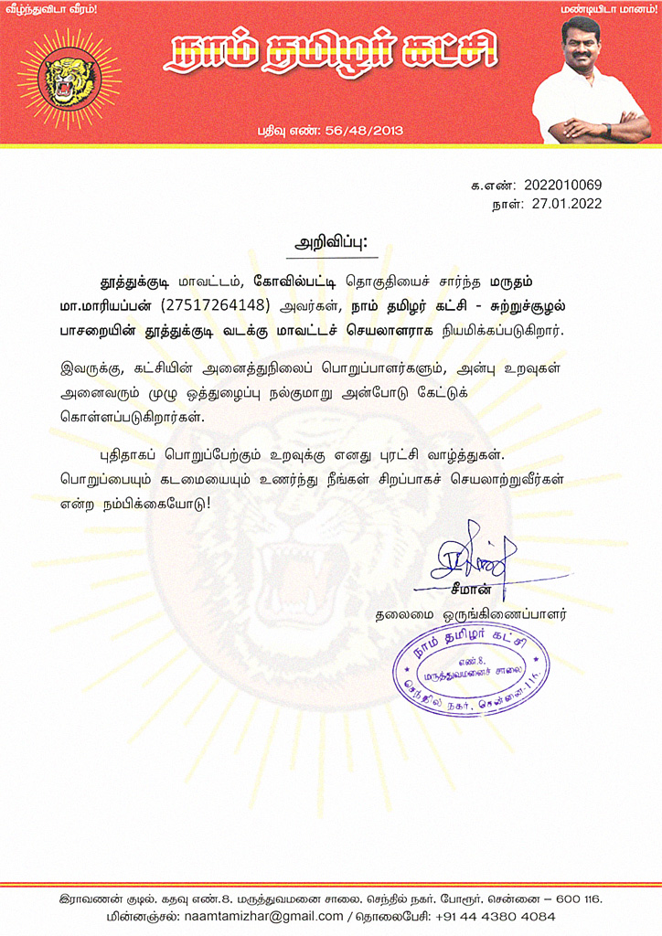 தூத்துக்குடி மாவட்டம், கோவில்பட்டி தொகுதியைச் சார்ந்த மருதம் மா.மாரியப்பன் (27517264148) அவர்கள், நாம் தமிழர் கட்சி – சுற்றுச்சூழல் பாசறையின் தூத்துக்குடி வடக்கு மாவட்டச் செயலாளராக நியமிக்கப்படுகிறார்.
