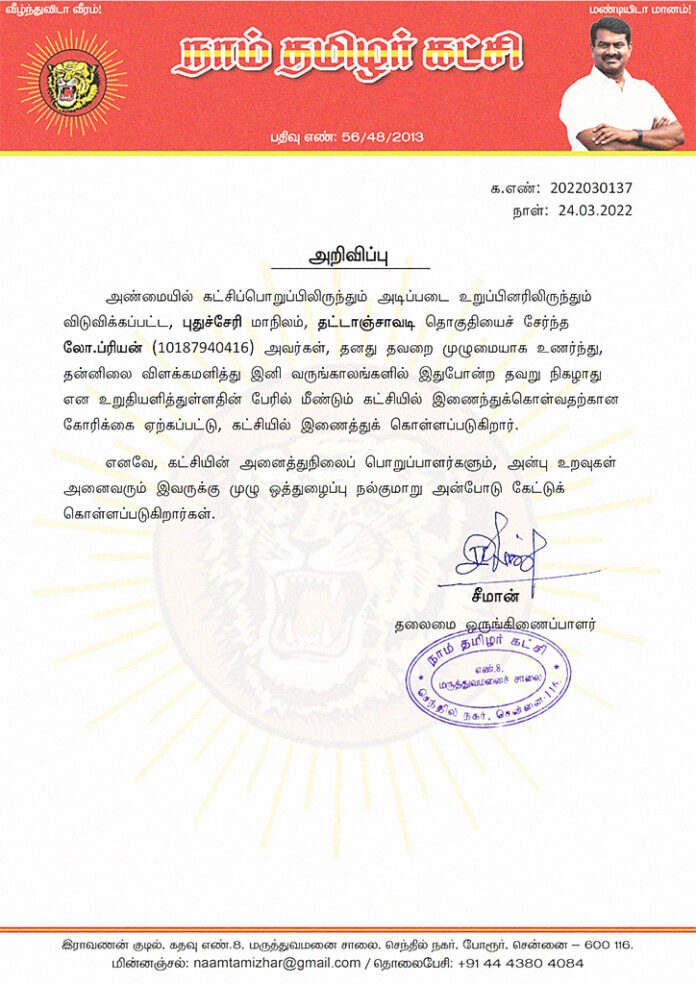 அண்மையில் கட்சிப்பொறுப்பிலிருந்தும் அடிப்படை உறுப்பினரிலிருந்தும் விடுவிக்கப்பட்ட, புதுச்சேரி மாநிலம், தட்டாஞ்சாவடி தொகுதியைச் சேர்ந்த லோ.ப்ரியன் (10187940416) அவர்கள், தனது தவறை முழுமையாக உணர்ந்து, தன்னிலை விளக்கமளித்து இனி வருங்காலங்களில் இதுபோன்ற தவறு நிகழாது என உறுதியளித்துள்ளதின் பேரில் மீண்டும் கட்சியில் இணைந்துக்கொள்வதற்கான கோரிக்கை ஏற்கப்பட்டு, கட்சியில் இணைத்துக் கொள்ளப்படுகிறார்.