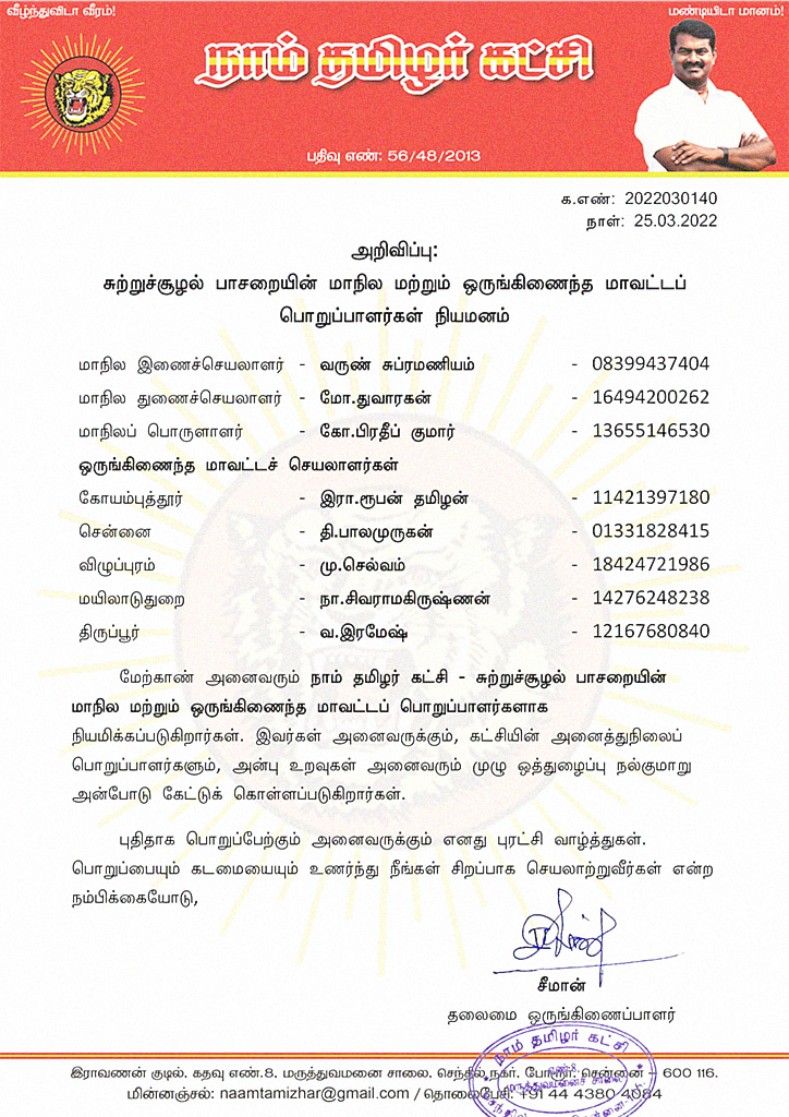 மேற்காண் அனைவரும் நாம் தமிழர் கட்சி – சுற்றுச்சூழல் பாசறையின் மாநில மற்றும் ஒருங்கிணைந்த மாவட்டப் பொறுப்பாளர்களாக நியமிக்கப்படுகிறார்கள். இவர்கள் அனைவருக்கும், கட்சியின் அனைத்துநிலைப் பொறுப்பாளர்களும், அன்பு உறவுகள் அனைவரும் முழு ஒத்துழைப்பு நல்குமாறு அன்போடு கேட்டுக் கொள்ளப்படுகிறார்கள்.