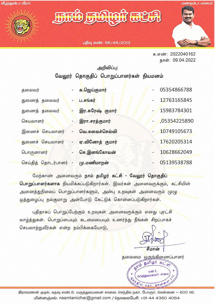 மேற்காண் அனைவரும் நாம் தமிழர் கட்சி – வேலூர் தொகுதிப் பொறுப்பாளர்களாக நியமிக்கப்படுகிறார்கள். இவர்கள் அனைவருக்கும், கட்சியின் அனைத்துநிலைப் பொறுப்பாளர்களும், அன்பு உறவுகள் அனைவரும் முழு ஒத்துழைப்பு நல்குமாறு அன்போடு கேட்டுக் கொள்ளப்படுகிறார்கள்.