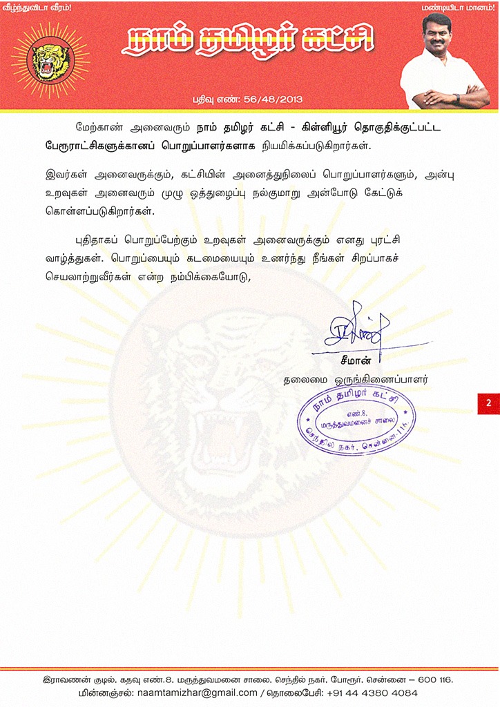 இவர்கள் அனைவருக்கும், கட்சியின் அனைத்துநிலைப் பொறுப்பாளர்களும், அன்பு உறவுகள் அனைவரும் முழு ஒத்துழைப்பு நல்குமாறு அன்போடு கேட்டுக் கொள்ளப்படுகிறார்கள்.