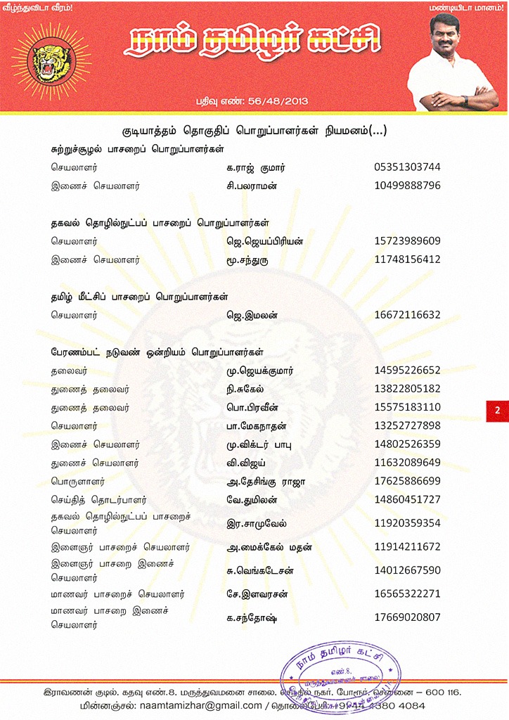 மேற்காண் அனைவரும் நாம் தமிழர் கட்சி – குடியாத்தம் தொகுதிப் பொறுப்பாளர்களாக நியமிக்கப்படுகிறார்கள். இவர்கள் அனைவருக்கும், கட்சியின் அனைத்துநிலைப் பொறுப்பாளர்களும், அன்பு உறவுகள் அனைவரும் முழு ஒத்துழைப்பு நல்குமாறு அன்போடு கேட்டுக் கொள்ளப்படுகிறார்கள்.
