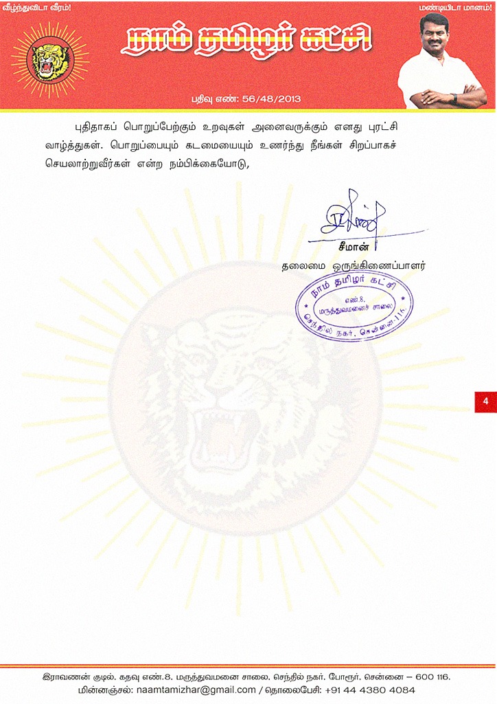 புதிதாகப் பொறுப்பேற்கும் உறவுகள் அனைவருக்கும் எனது புரட்சி வாழ்த்துகள். பொறுப்பையும் கடமையையும் உணர்ந்து நீங்கள் சிறப்பாகச் செயலாற்றுவீர்கள் என்ற நம்பிக்கையோடு,
