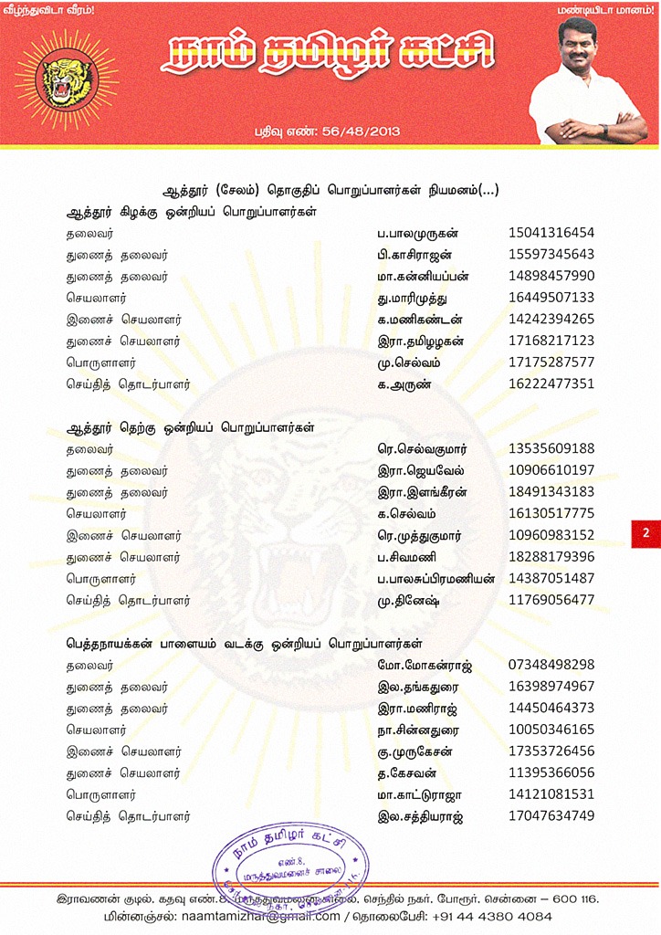 மேற்காண் அனைவரும் நாம் தமிழர் கட்சி – ஆத்தூர் (சேலம்) தொகுதிப் பொறுப்பாளர்களாக நியமிக்கப்படுகிறார்கள்.