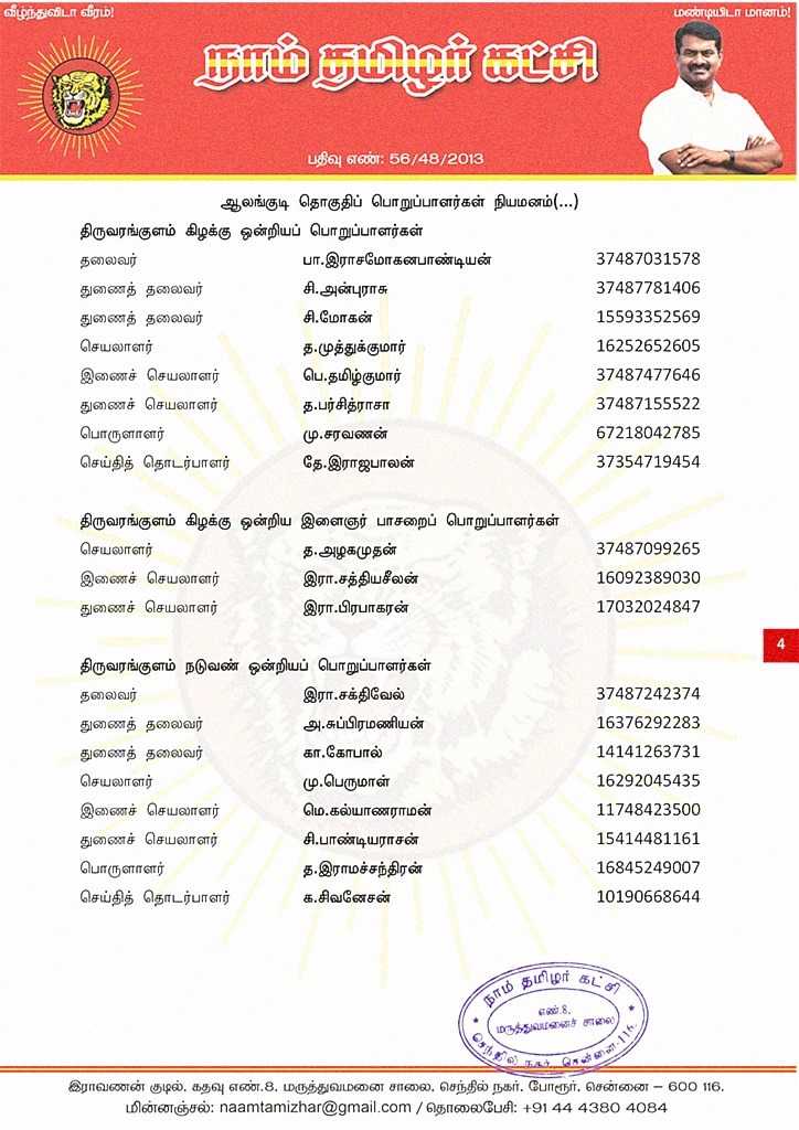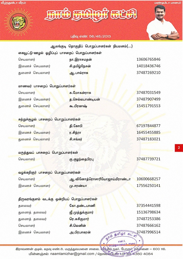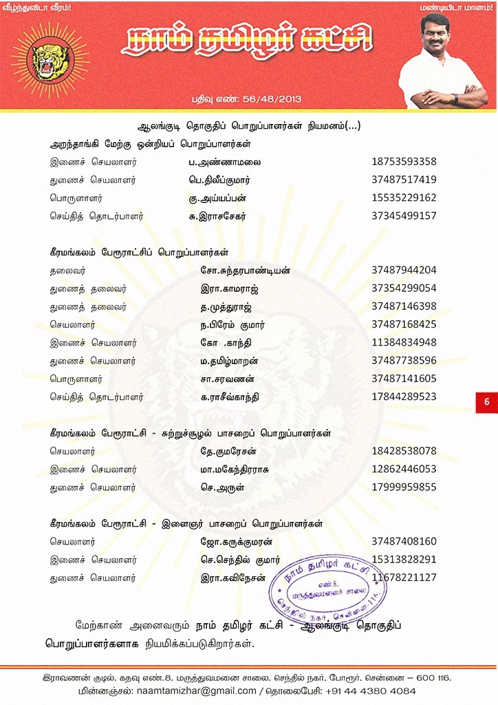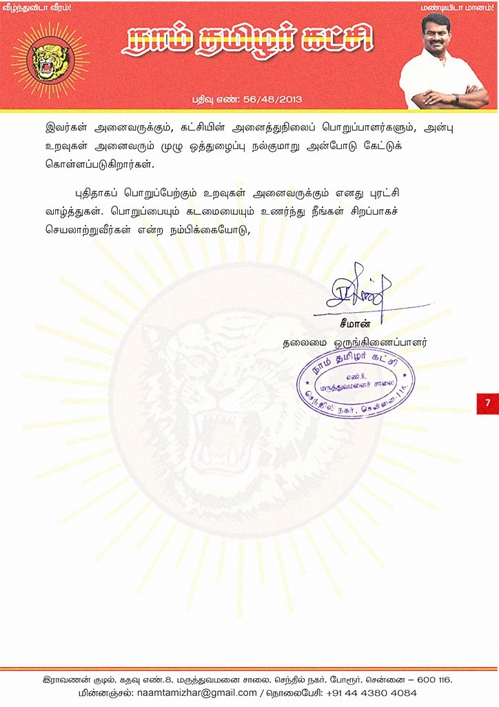 இவர்கள் அனைவருக்கும், கட்சியின் அனைத்துநிலைப் பொறுப்பாளர்களும், அன்பு உறவுகள் அனைவரும் முழு ஒத்துழைப்பு நல்குமாறு அன்போடு கேட்டுக் கொள்ளப்படுகிறார்கள்.