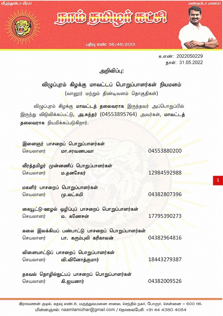 மேற்காண் அனைவரும் நாம் தமிழர் கட்சி – விழுப்புரம் கிழக்கு மாவட்டப் பொறுப்பாளர்களாக நியமிக்கப்படுகிறார்கள்.