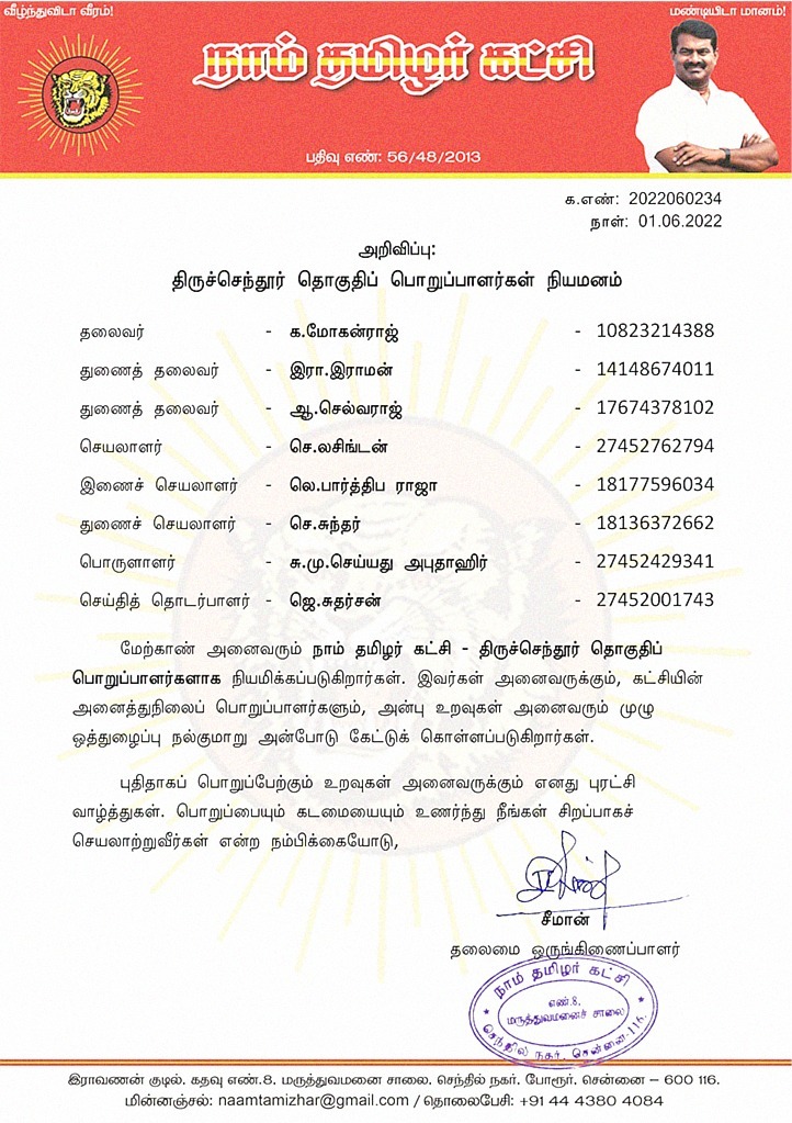 மேற்காண் அனைவரும் நாம் தமிழர் கட்சி – திருச்செந்தூர் தொகுதிப் பொறுப்பாளர்களாக நியமிக்கப்படுகிறார்கள். இவர்கள் அனைவருக்கும், கட்சியின் அனைத்துநிலைப் பொறுப்பாளர்களும், அன்பு உறவுகள் அனைவரும் முழு ஒத்துழைப்பு நல்குமாறு அன்போடு கேட்டுக் கொள்ளப்படுகிறார்கள்.