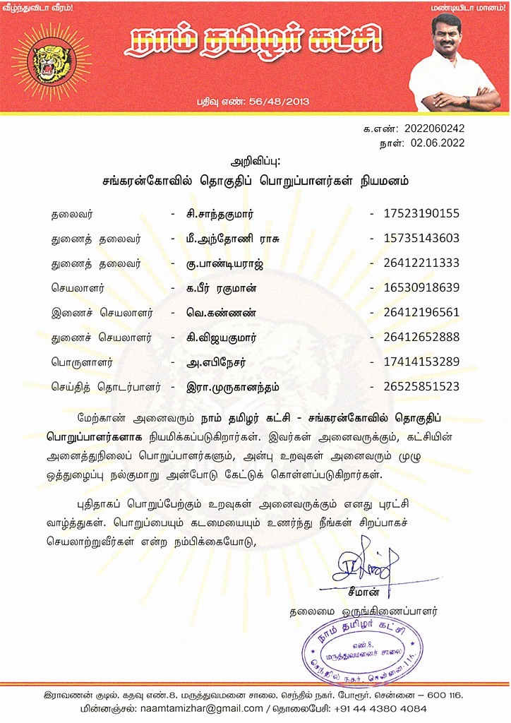 மேற்காண் அனைவரும் நாம் தமிழர் கட்சி – சங்கரன்கோவில் தொகுதிப் பொறுப்பாளர்களாக நியமிக்கப்படுகிறார்கள். இவர்கள் அனைவருக்கும், கட்சியின் அனைத்துநிலைப் பொறுப்பாளர்களும், அன்பு உறவுகள் அனைவரும் முழு ஒத்துழைப்பு நல்குமாறு அன்போடு கேட்டுக் கொள்ளப்படுகிறார்கள்.