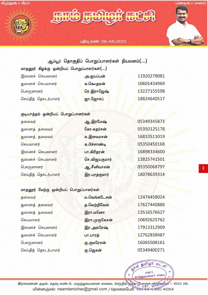 மேற்காண் அனைவரும் நாம் தமிழர் கட்சி – ஆம்பூர் தொகுதிப் பொறுப்பாளர்களாக நியமிக்கப்படுகிறார்கள். இவர்கள் அனைவருக்கும், கட்சியின் அனைத்துநிலைப் பொறுப்பாளர்களும், அன்பு உறவுகள் அனைவரும் முழு ஒத்துழைப்பு நல்குமாறு அன்போடு கேட்டுக் கொள்ளப்படுகிறார்கள்.