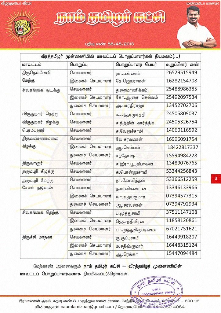 மேற்காண் அனைவரும் நாம் தமிழர் கட்சி வீரத்தமிழர் முன்னணியின் மாவட்டப் பொறுப்பாளர்களாக நியமிக்கப்படுகிறார்கள்.