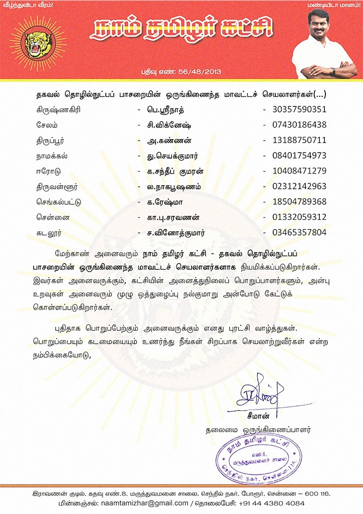 மேற்காண் அனைவரும் நாம் தமிழர் கட்சி தகவல் தொழில்நுட்பப் பாசறையின் ஒருங்கிணைந்த மாவட்டச் செயலாளர்களாக நியமிக்கப்படுகிறார்கள். இவர்கள் அனைவருக்கும், கட்சியின் அனைத்துநிலைப் பொறுப்பாளர்களும், அன்பு உறவுகள் அனைவரும் முழு ஒத்துழைப்பு நல்குமாறு அன்போடு கேட்டுக் கொள்ளப்படுகிறார்கள்.