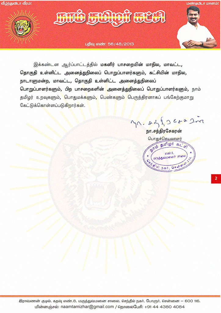 இக்கண்டன ஆர்ப்பாட்டத்தில் மகளிர் பாசறையின் மாநில, மாவட்ட, தொகுதி உள்ளிட்ட அனைத்துநிலைப் பொறுப்பாளர்களும், கட்சியின் மாநில, நாடாளுமன்ற, மாவட்ட, தொகுதி உள்ளிட்ட அனைத்துநிலைப் பொறுப்பாளர்களும், பிற பாசறைகளின் அனைத்துநிலைப் பொறுப்பாளர்களும், நாம் தமிழர் உறவுகளும், பொதுமக்களும், பெண்களும் பெருந்திரளாகப் பங்கேற்குமாறு கேட்டுக்கொள்ளப்படுகிறார்கள்.