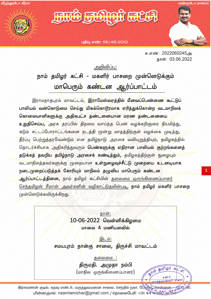 இராமநாதபுரம் மாவட்டம், இராமேஸ்வரத்தில் மீனவப்பெண்ணை கூட்டுப் பாலியல் வன்கொடுமை செய்து மிகக்கொடூரமாக எரித்துக்கொன்ற வடமாநிலக் கொலையாளிகளுக்கு அதிகபட்ச தண்டனையான மரண தண்டனையை உறுதிசெய்ய, அரசு தரப்பில் திறமை வாய்ந்த பெண் வழக்கறிஞரை நியமித்து, கடும் சட்டப்போராட்டங்களை நடத்தி மூன்று மாதத்திற்குள் வழக்கை முடித்து, தீர்ப்பு பெற்றுத்தரவேண்டும் என தமிழ்நாடு அரசை வலியுறுத்தியும், தமிழகத்தில் தொடர்ச்சியாக அதிகரித்துவரும் பெண்களுக்கு எதிரான பாலியல் குற்றங்களைத் தடுக்கத் தவறிய தமிழ்நாடு அரசைக் கண்டித்தும், தமிழகத்திற்குள் நுழையும் வடமாநிலத்தவர்களுக்கு முறையான உள்நுழைவுச்சீட்டு முறையை உடனடியாக நடைமுறைப்படுத்தக் கோரியும் மாநிலம் தழுவிய மாபெரும் கண்டன ஆர்ப்பாட்டத்தினை, நாம் தமிழர் கட்சியின் தலைமை ஒருங்கிணைப்பாளர் செந்தமிழன் சீமான் அவர்களின் வழிகாட்டுதலின்படி, நாம் தமிழர் மகளிர் பாசறை முன்னெடுக்கவிருக்கிறது.