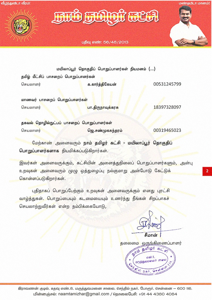 மேற்காண் அனைவரும் நாம் தமிழர் கட்சி மயிலாப்பூர் தொகுதிப் பொறுப்பாளர்களாக நியமிக்கப்படுகிறார்கள்.