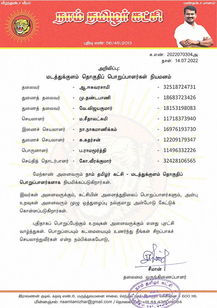 மேற்காண் அனைவரும் நாம் தமிழர் கட்சி – மடத்துக்குளம் தொகுதிப் பொறுப்பாளர்களாக நியமிக்கப்படுகிறார்கள்.