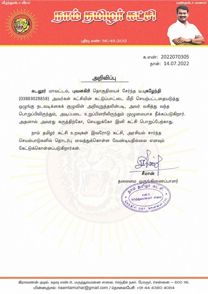 கடலூர் மாவட்டம், புவனகிரி தொகுதியைச் சேர்ந்த .புகழேந்தி (03883028858) அவர்கள் கட்சியின் கட்டுப்பாட்டை மீறி செயற்பட்டதையடுத்து ஒழுங்கு நடவடிக்கைக் குழுவின் அறிவுறுத்தலின்படி, அவர் வகித்து வந்த பொறுப்பிலிருந்தும், அடிப்படை உறுப்பினரிலிருந்தும் முழுமையாக நீக்கப்படுகிறார். அதனால் அவரது கருத்திற்கோ, செயலுக்கோ இனி கட்சி பொறுப்பேற்காது.