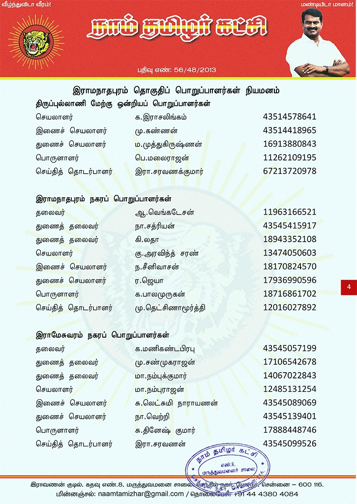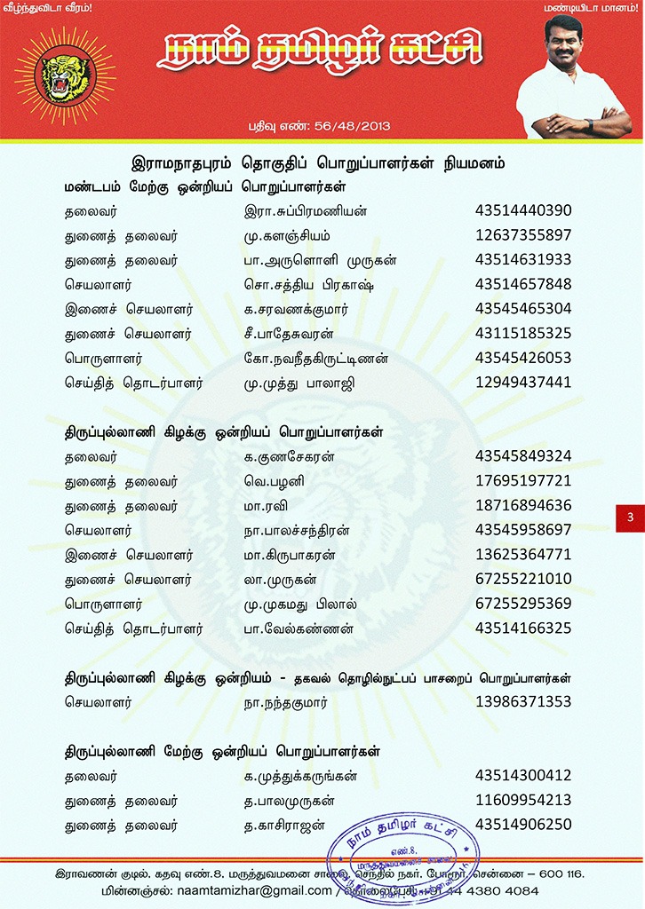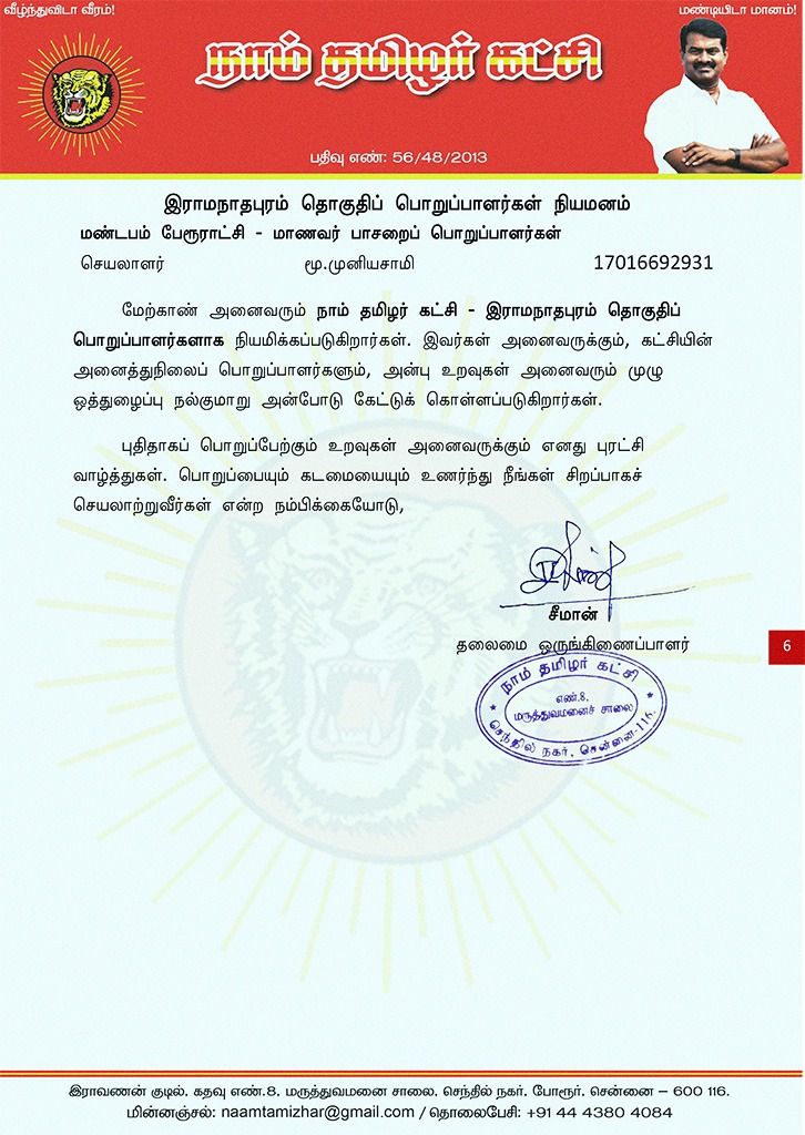 மேற்காண் அனைவரும் நாம் தமிழர் கட்சி – இராமநாதபுரம் தொகுதிப் பொறுப்பாளர்களாக நியமிக்கப்படுகிறார்கள். இவர்கள் அனைவருக்கும், கட்சியின் அனைத்துநிலைப் பொறுப்பாளர்களும், அன்பு உறவுகள் அனைவரும் முழு ஒத்துழைப்பு நல்குமாறு அன்போடு கேட்டுக் கொள்ளப்படுகிறார்கள்.