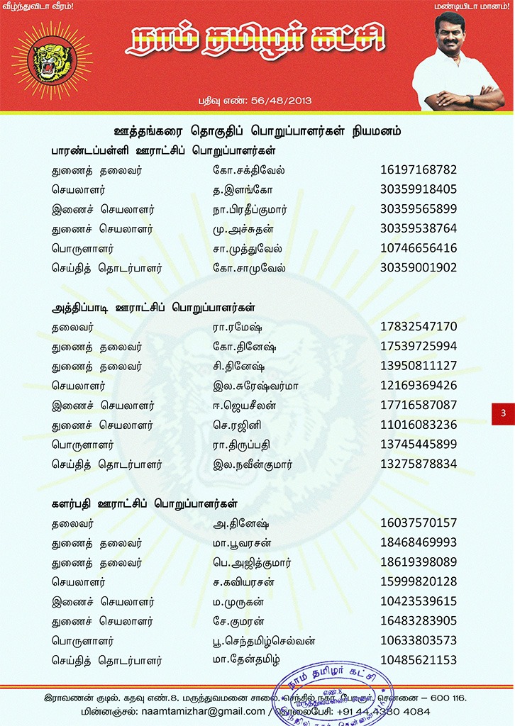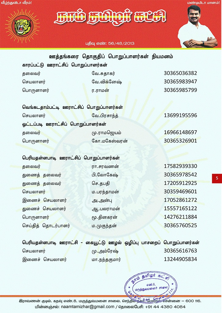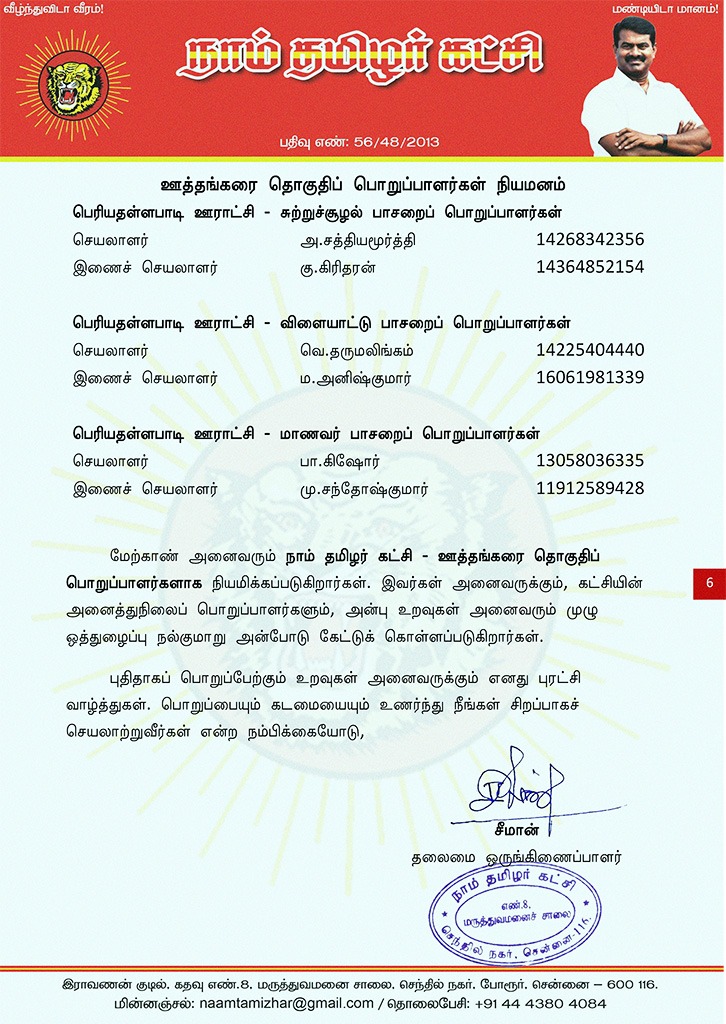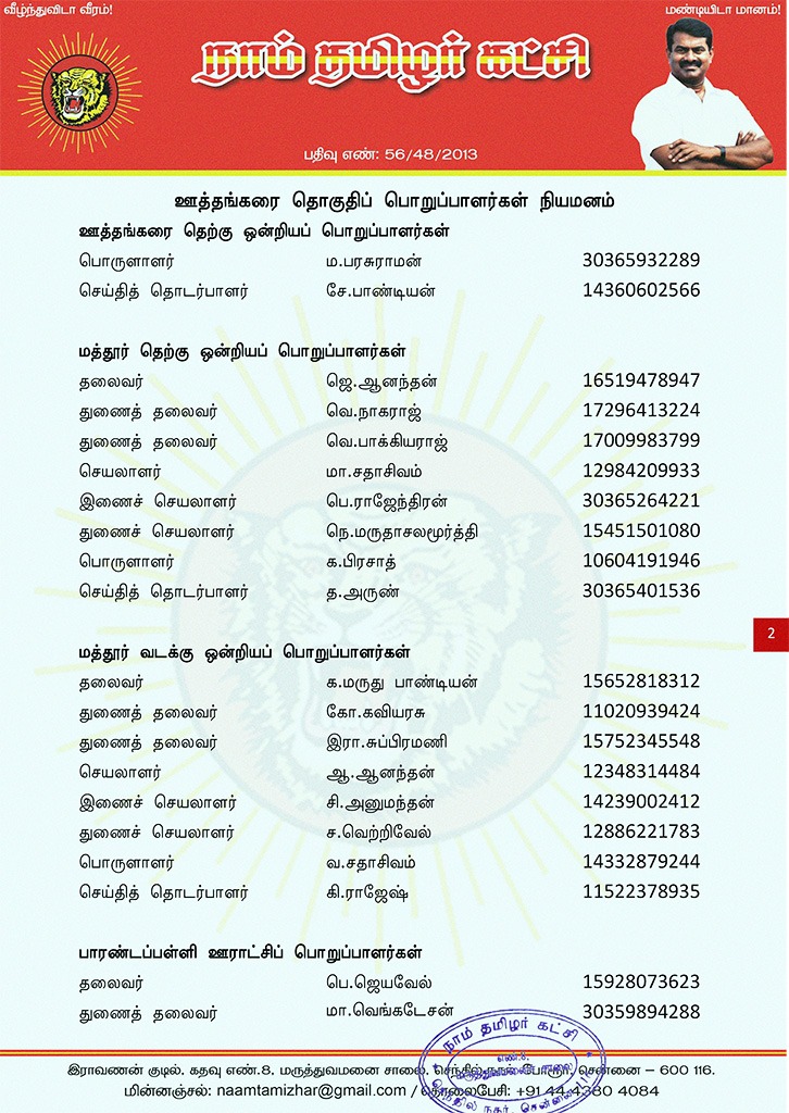 மேற்காண் அனைவரும் நாம் தமிழர் கட்சி ஊத்தங்கரை தொகுதிப் பொறுப்பாளர்களாக நியமிக்கப்படுகிறார்கள். இவர்கள் அனைவருக்கும், கட்சியின் அனைத்துநிலைப் பொறுப்பாளர்களும், அன்பு உறவுகள் அனைவரும் முழு ஒத்துழைப்பு நல்குமாறு அன்போடு கேட்டுக் கொள்ளப்படுகிறார்கள்.