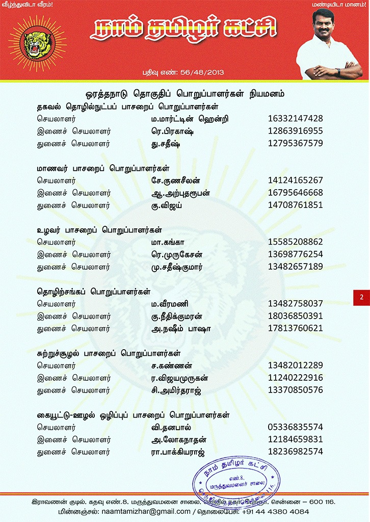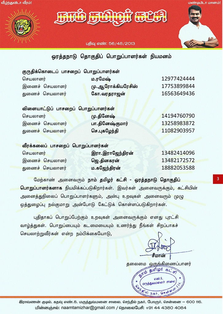 மேற்காண் அனைவரும் நாம் தமிழர் கட்சி ஒரத்தநாடு தொகுதிப் பொறுப்பாளர்களாக நியமிக்கப்படுகிறார்கள். இவர்கள் அனைவருக்கும், கட்சியின் அனைத்துநிலைப் பொறுப்பாளர்களும், அன்பு உறவுகள் அனைவரும் முழு ஒத்துழைப்பு நல்குமாறு அன்போடு கேட்டுக் கொள்ளப்படுகிறார்கள்.