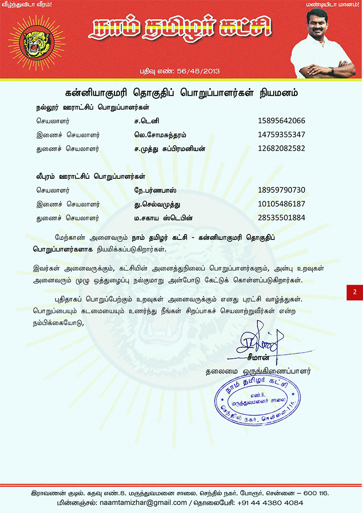 மேற்காண் அனைவரும் நாம் தமிழர் கட்சி – கன்னியாகுமரி தொகுதிப் பொறுப்பாளர்களாக நியமிக்கப்படுகிறார்கள்.