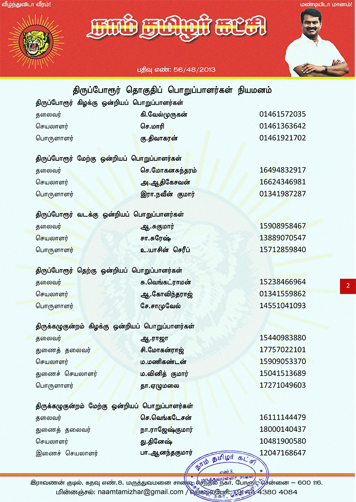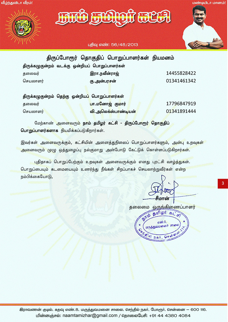 மேற்காண் அனைவரும் நாம் தமிழர் கட்சி – திருப்போரூர் தொகுதிப் பொறுப்பாளர்களாக நியமிக்கப்படுகிறார்கள்.