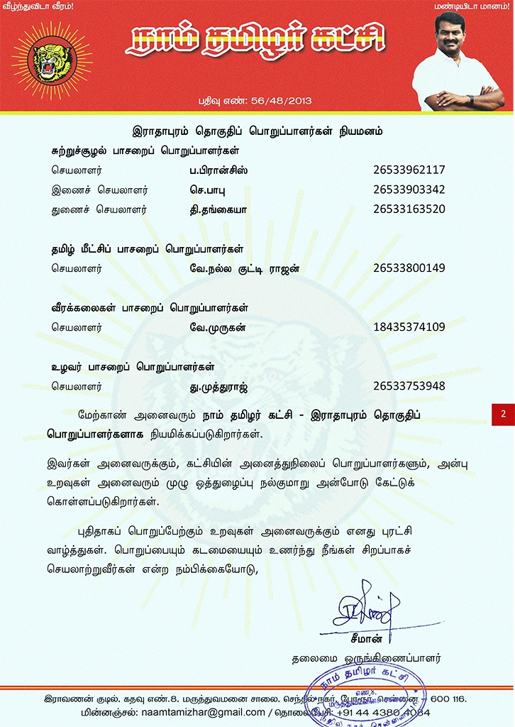 மேற்காண் அனைவரும் நாம் தமிழர் கட்சி இராதாபுரம் தொகுதிப் பொறுப்பாளர்களாக நியமிக்கப்படுகிறார்கள்.