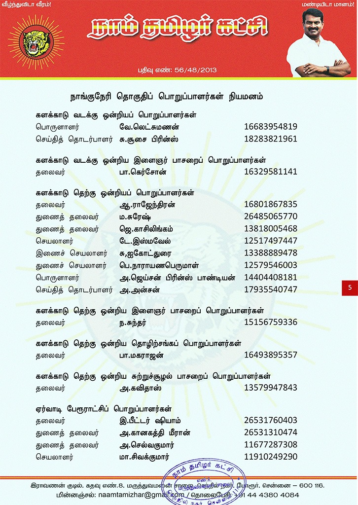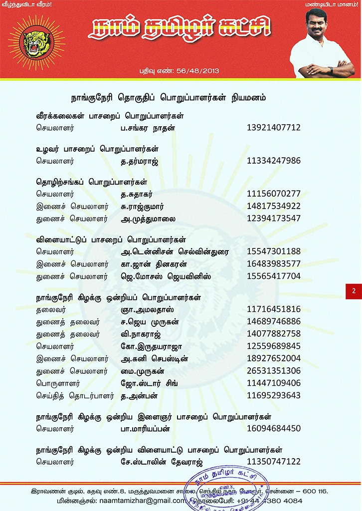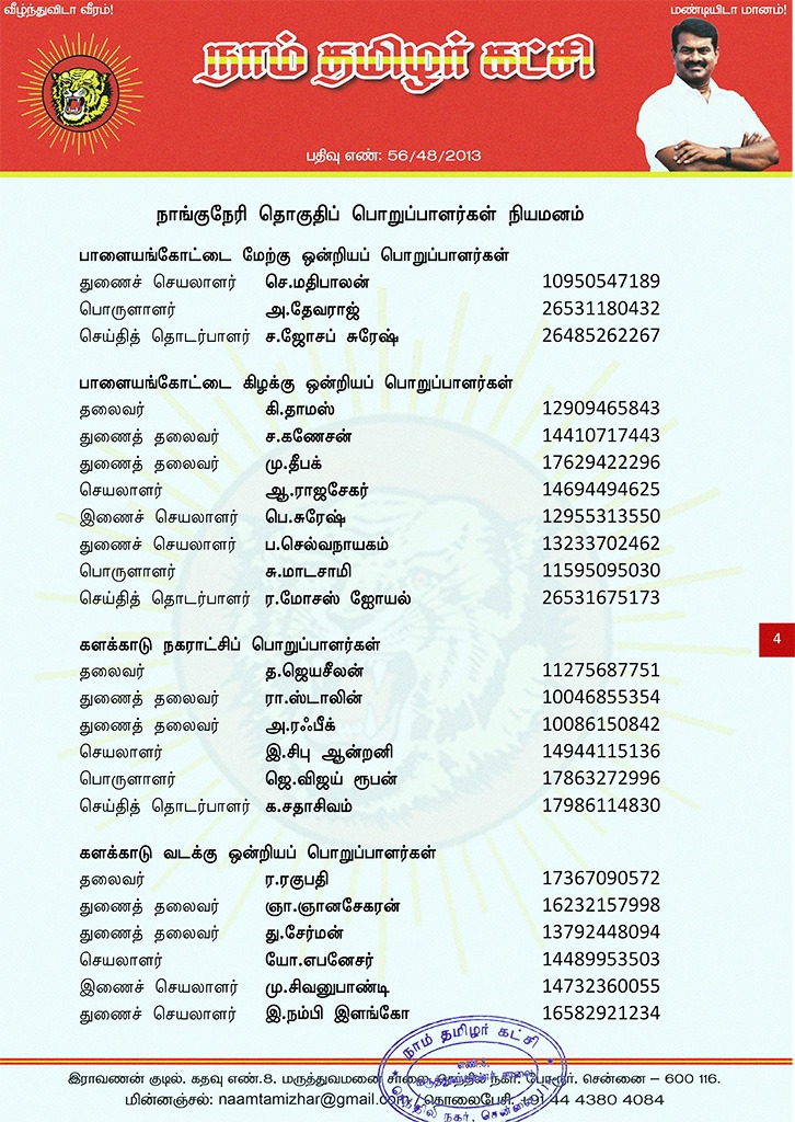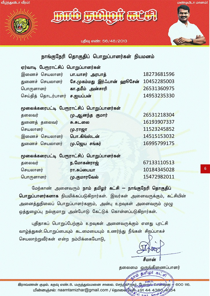 மேற்காண் அனைவரும் நாம் தமிழர் கட்சி – நாங்குநேரி தொகுதிப் பொறுப்பாளர்களாக நியமிக்கப்படுகிறார்கள். இவர்கள் அனைவருக்கும், கட்சியின் அனைத்துநிலைப் பொறுப்பாளர்களும், அன்பு உறவுகள் அனைவரும் முழு ஒத்துழைப்பு நல்குமாறு அன்போடு கேட்டுக் கொள்ளப்படுகிறார்கள்.