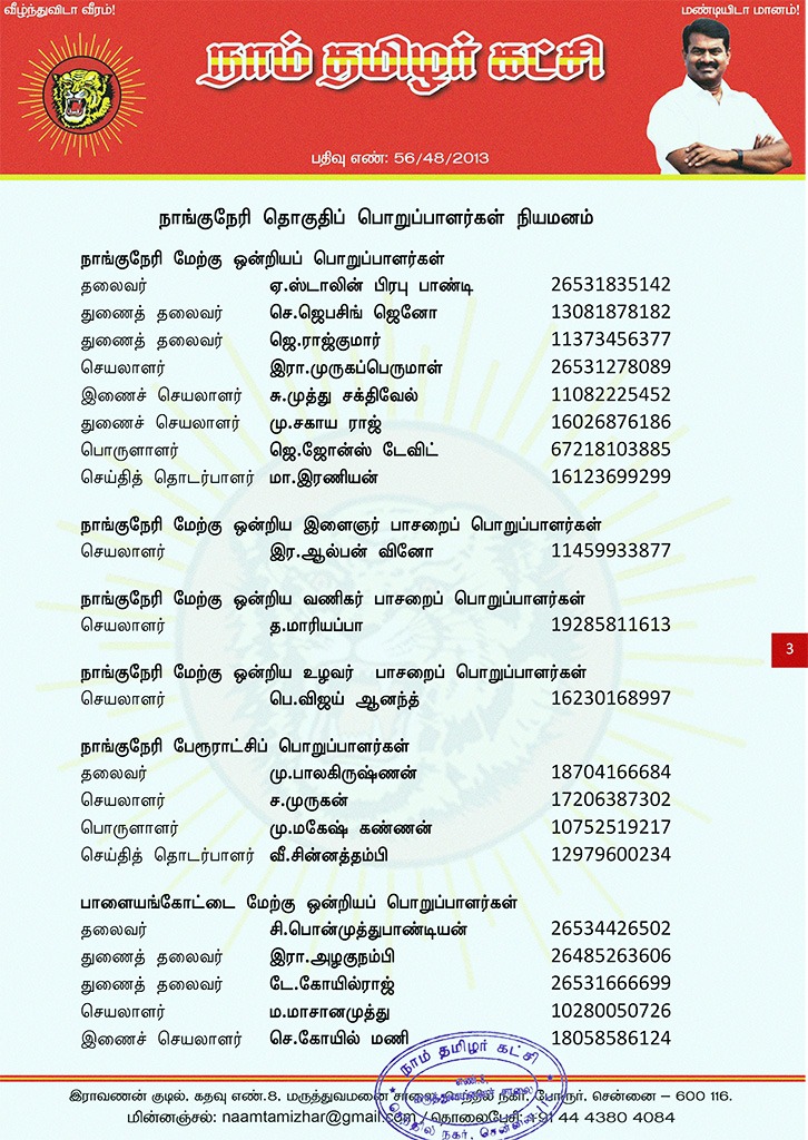மேற்காண் அனைவரும் நாம் தமிழர் கட்சி – நாங்குநேரி தொகுதிப் பொறுப்பாளர்களாக நியமிக்கப்படுகிறார்கள். இவர்கள் அனைவருக்கும், கட்சியின் அனைத்துநிலைப் பொறுப்பாளர்களும், அன்பு உறவுகள் அனைவரும் முழு ஒத்துழைப்பு நல்குமாறு அன்போடு கேட்டுக் கொள்ளப்படுகிறார்கள்.