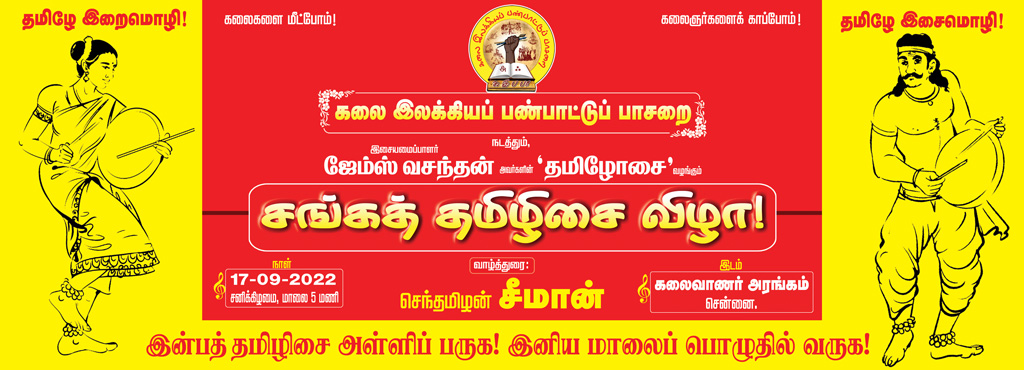 நாம் தமிழர் கட்சியின் கலை, இலக்கியப் பண்பாட்டுப் பாசறை நடத்தும், இசையமைப்பாளர் ஜேம்ஸ் வசந்தன் அவர்களினுடைய ‘தமிழோசை’ வழங்கும் சங்கத் தமிழிசை விழா வருகிற 17-09-2022 சனிக்கிழமையன்று மாலை 5 மணியளவில் சென்னை, கலைவாணர் அரங்கத்தில் நடைபெறவிருக்கிறது. தங்கள் தொகுதிகளில் இந்நிகழ்விற்கான வரவேற்பு பதாகைகள் வைக்கவும், சுவரொட்டிகள் அச்சடித்து ஒட்டுவதற்குமான வடிவமைப்புகளை கீழேயுள்ள இணைப்பில் சென்று தரவிறக்கம் செய்து பயன்படுத்திக்கொள்ளவும்.