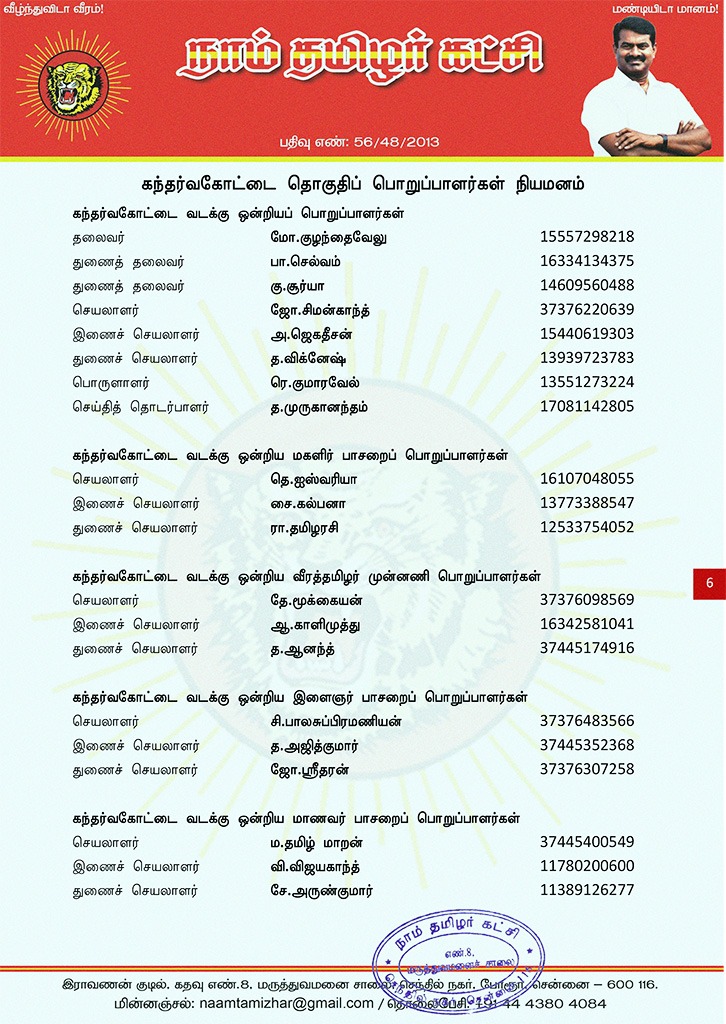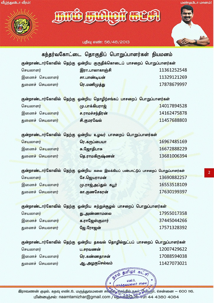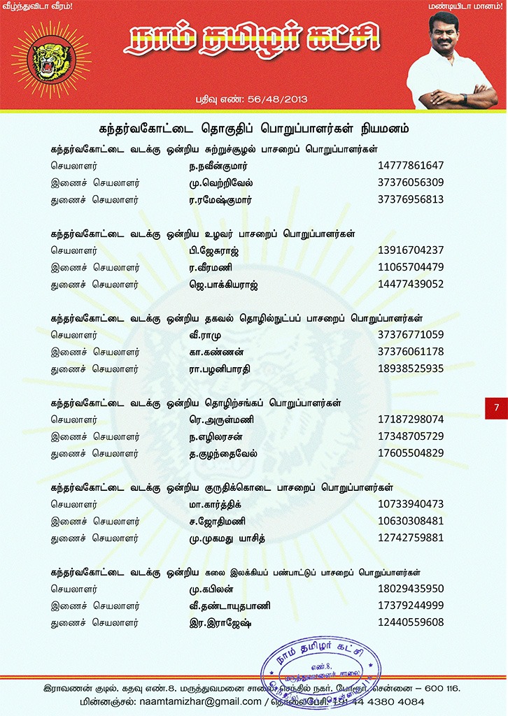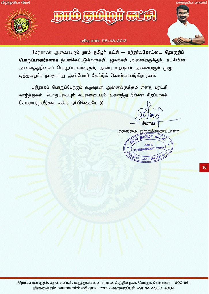 மேற்காண் அனைவரும் நாம் தமிழர் கட்சி கந்தர்வகோட்டை தொகுதிப் பொறுப்பாளர்களாக நியமிக்கப்படுகிறார்கள். இவர்கள் அனைவருக்கும், கட்சியின் அனைத்துநிலைப் பொறுப்பாளர்களும், அன்பு உறவுகள் அனைவரும் முழு ஒத்துழைப்பு நல்குமாறு அன்போடு கேட்டுக் கொள்ளப்படுகிறார்கள்.