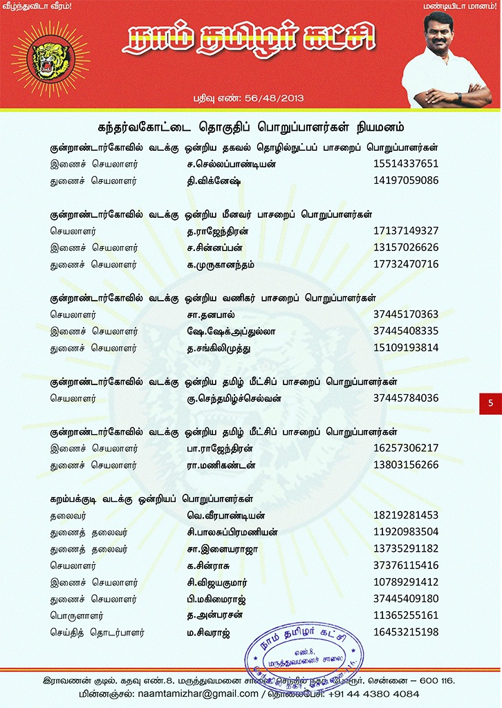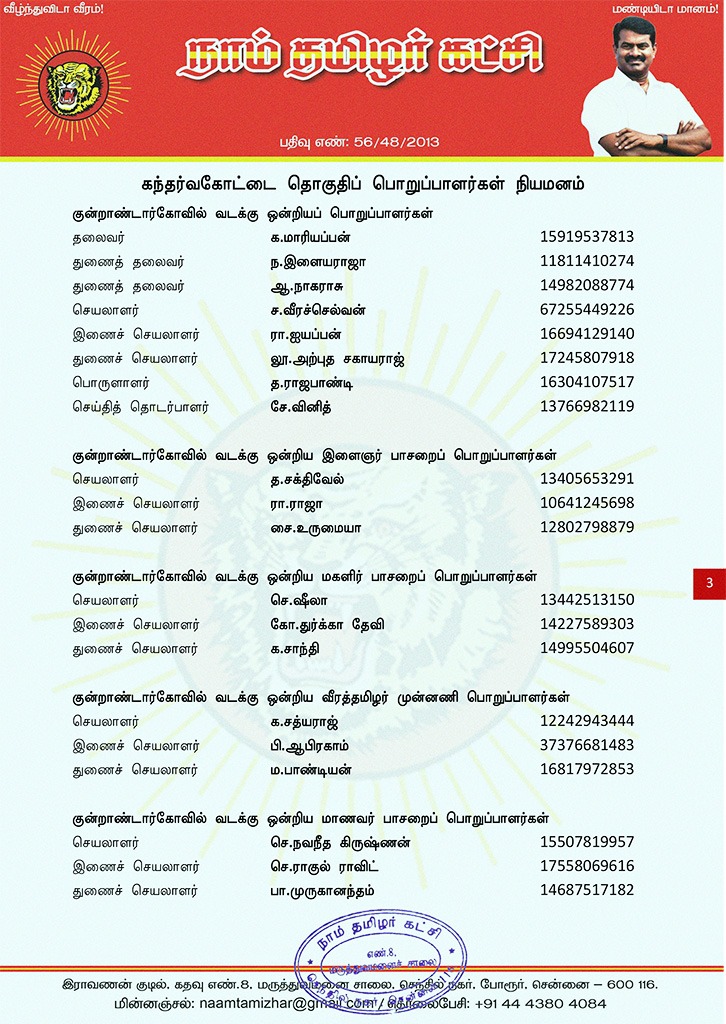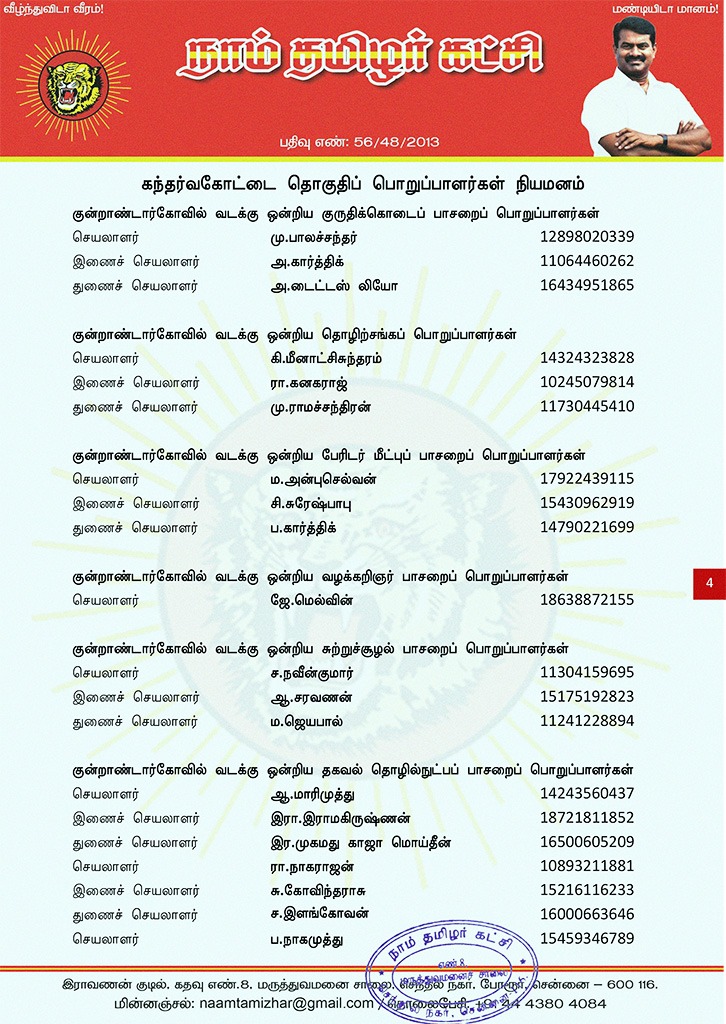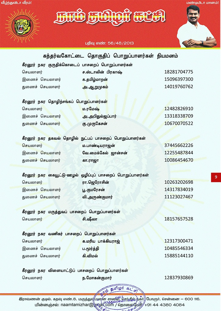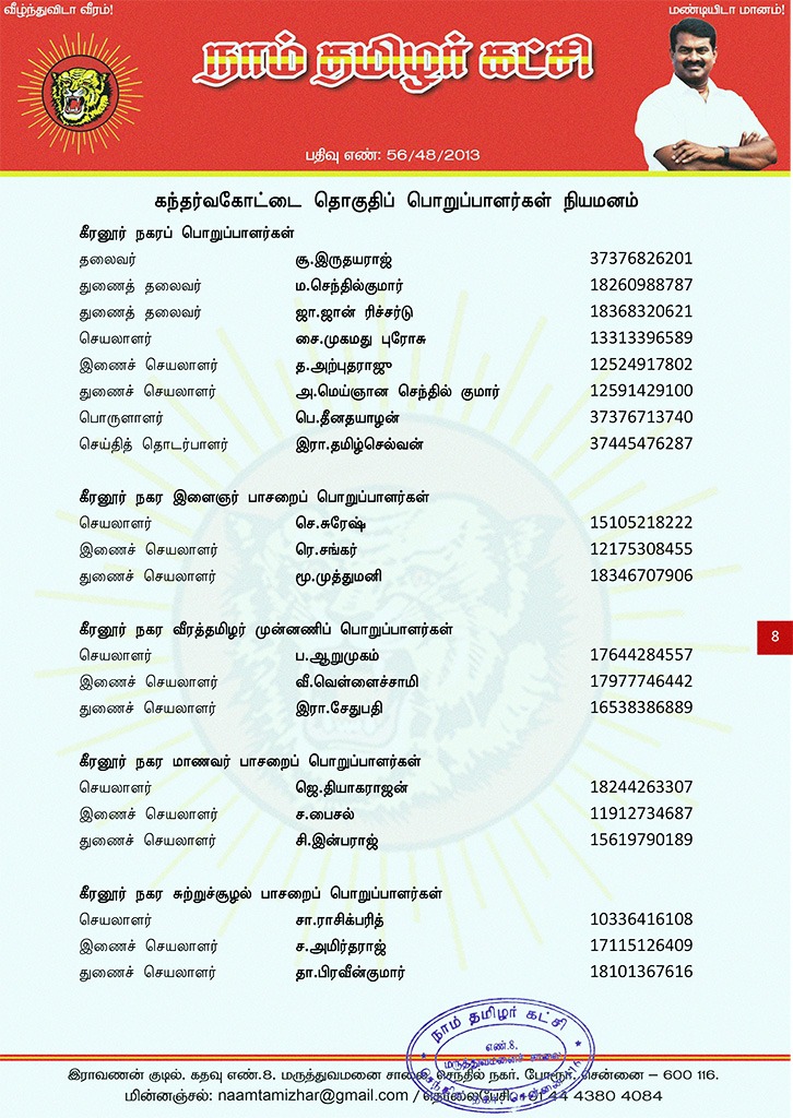 மேற்காண் அனைவரும் நாம் தமிழர் கட்சி கந்தர்வகோட்டை தொகுதிப் பொறுப்பாளர்களாக நியமிக்கப்படுகிறார்கள். இவர்கள் அனைவருக்கும், கட்சியின் அனைத்துநிலைப் பொறுப்பாளர்களும், அன்பு உறவுகள் அனைவரும் முழு ஒத்துழைப்பு நல்குமாறு அன்போடு கேட்டுக் கொள்ளப்படுகிறார்கள்.