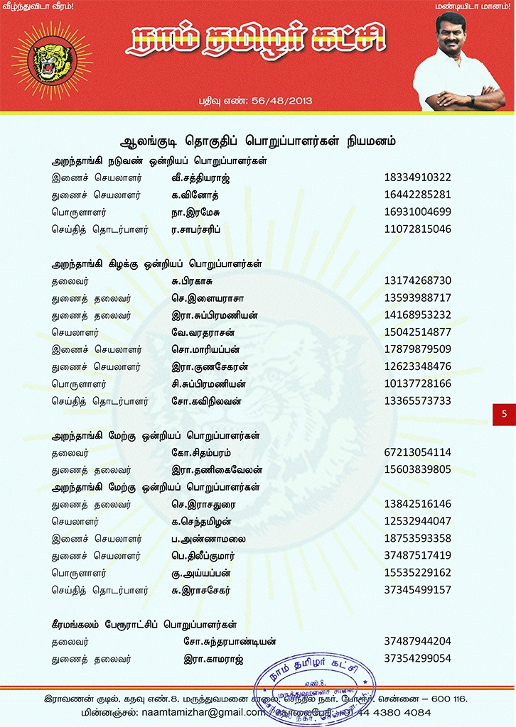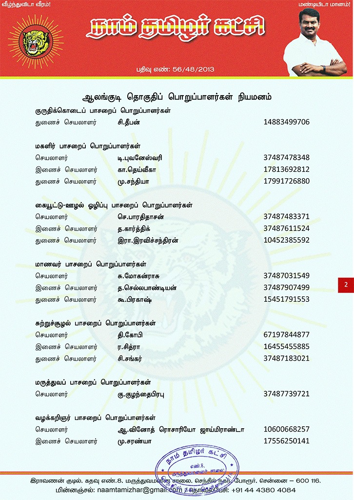 மேற்காண் அனைவரும் நாம் தமிழர் கட்சி – ஆலங்குடி தொகுதிப் பொறுப்பாளர்களாக நியமிக்கப்படுகிறார்கள். இவர்கள் அனைவருக்கும், கட்சியின் அனைத்துநிலைப் பொறுப்பாளர்களும், அன்பு உறவுகள் அனைவரும் முழு ஒத்துழைப்பு நல்குமாறு அன்போடு கேட்டுக் கொள்ளப்படுகிறார்கள்.
