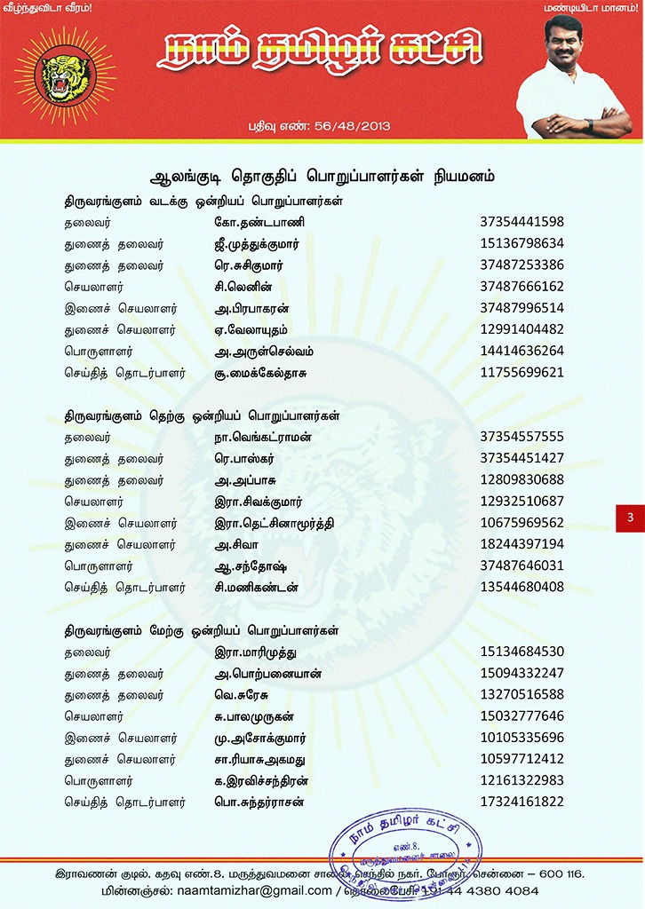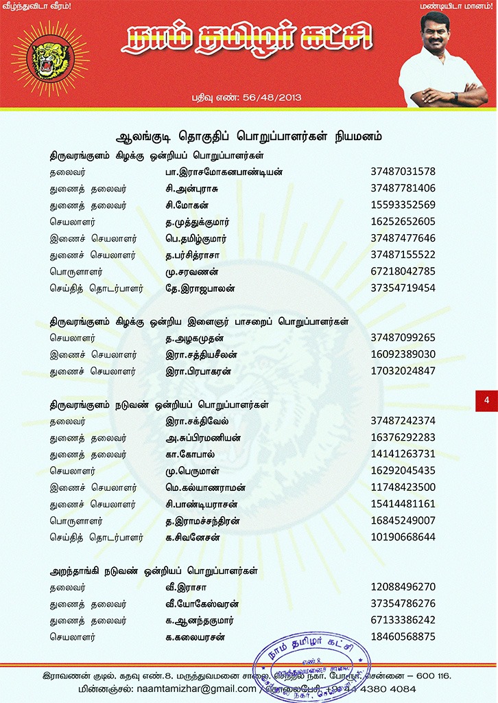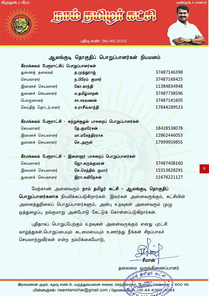 மேற்காண் அனைவரும் நாம் தமிழர் கட்சி – ஆலங்குடி தொகுதிப் பொறுப்பாளர்களாக நியமிக்கப்படுகிறார்கள். இவர்கள் அனைவருக்கும், கட்சியின் அனைத்துநிலைப் பொறுப்பாளர்களும், அன்பு உறவுகள் அனைவரும் முழு ஒத்துழைப்பு நல்குமாறு அன்போடு கேட்டுக் கொள்ளப்படுகிறார்கள்.